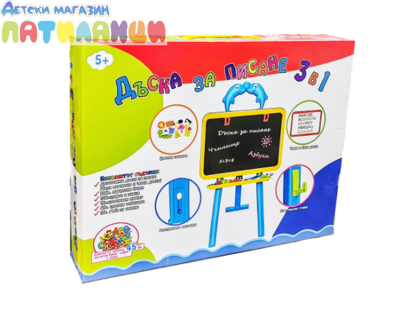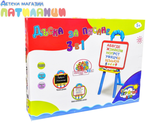 3 в 1 Магнитна Дъска за Писане и Рисуване- най- добрият домашен учител за всички деца! Страхотен комплект, включващ двустранна дъска, която от едната страна е бяла магнитна дъска, а от другата черна дъска. Магнитни цветни буквички и цифри и вълшебен маркер с гъба за почистване също влизат в играта. А когато не Ви се учи, отдайте се на разпускащо творчество върху бялото платно или с тебешири по черната дъска.