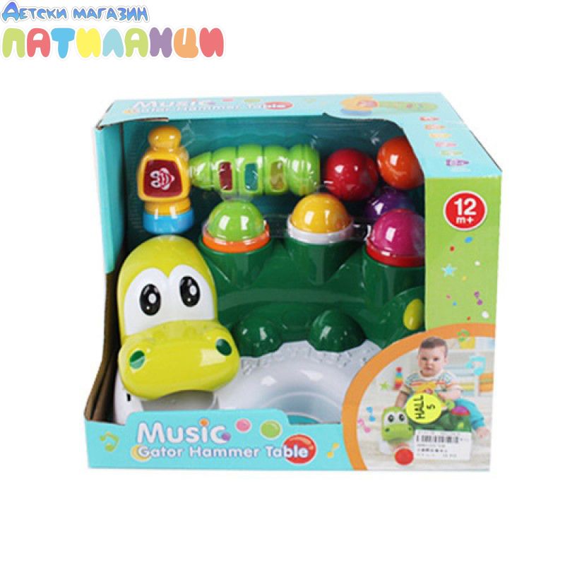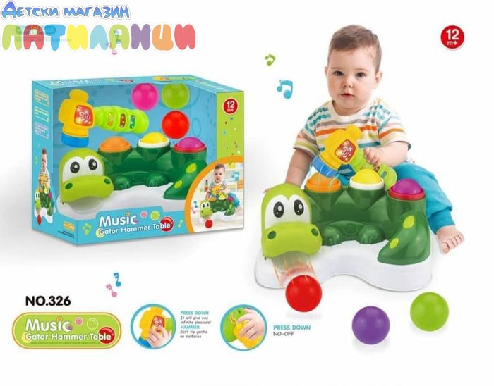 Играчката е оборудвана с чук и топки. Музикална играчка със светлинни ефекти.