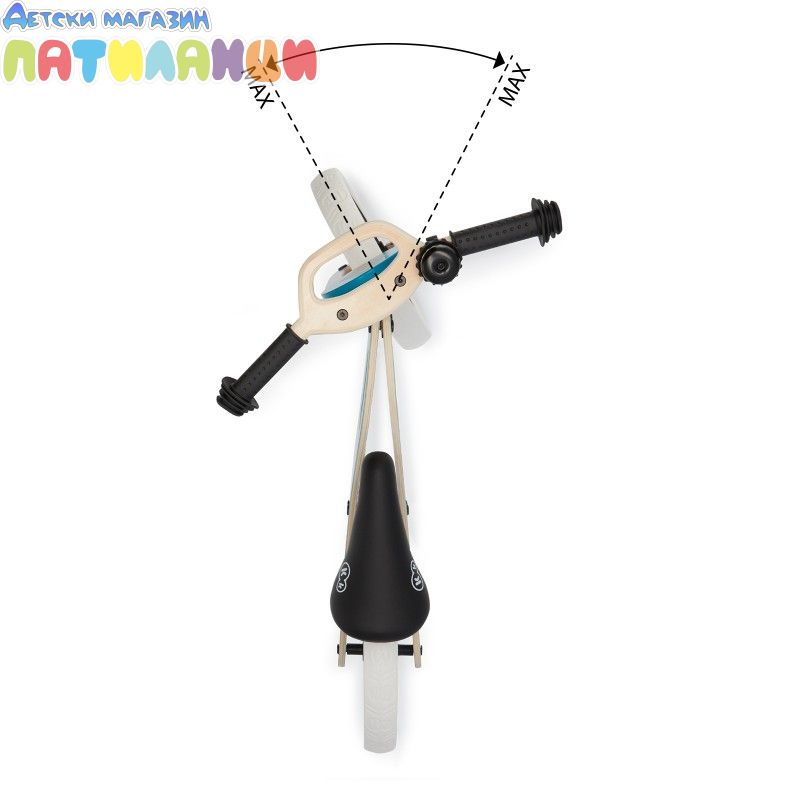 Единственото дървено колело за баланс, което има седалка, която е монтирана върху метална опора, която има голям диапазон за регулиране (30-40 см).