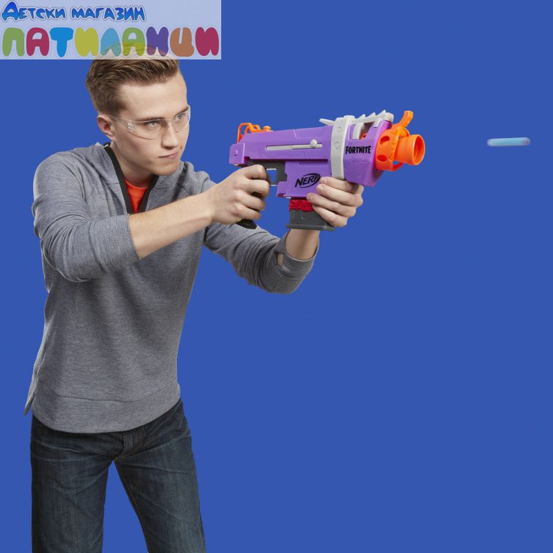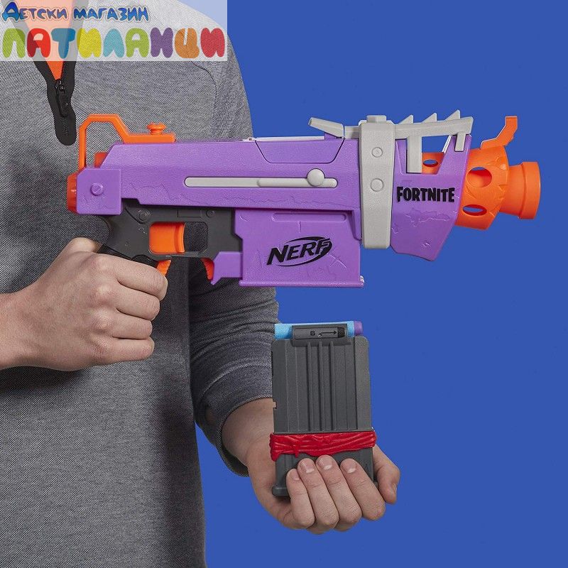Вдъхновен от оръжието, използвано във Fortnite, SMG-E бластерът улавя външния вид на този в популярната видео игра,