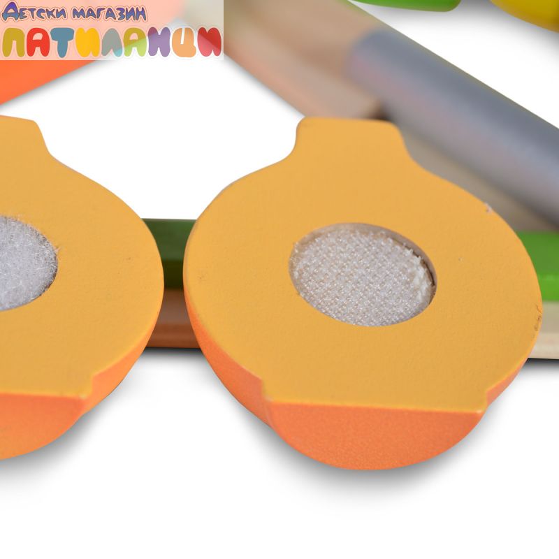 С помощта на дървеното ножче Вашето мъниче може да нареже хранителните продукти на няколко части върху дъската, а след това отново да съедини парчетата.