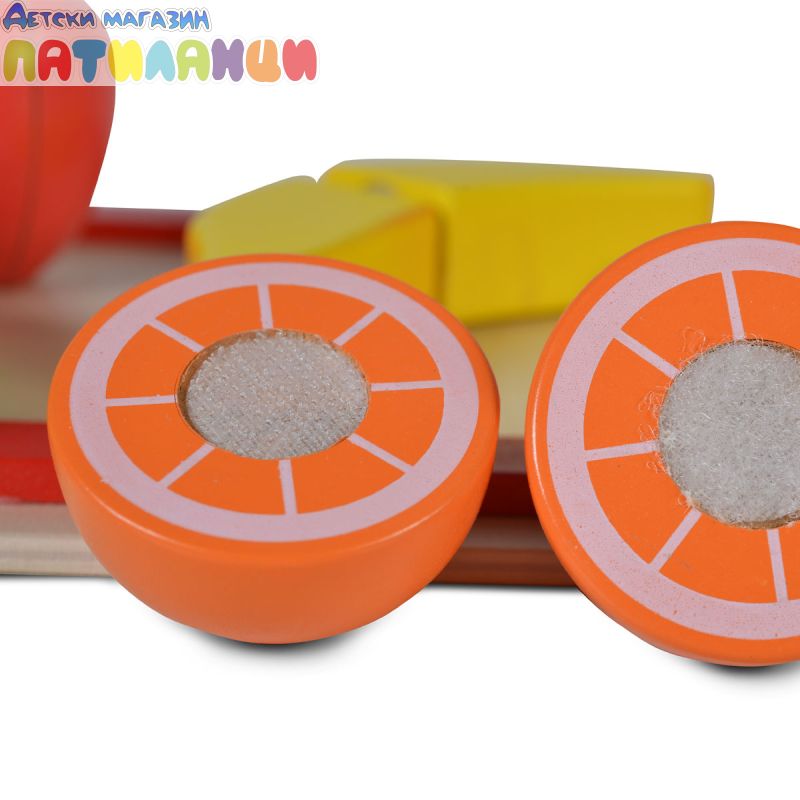 Комплектът за рязане включва няколко дървени части: дъска за рязане, ножче и 5 плодчета (ябълка, ягода, портокал, банан и круша).