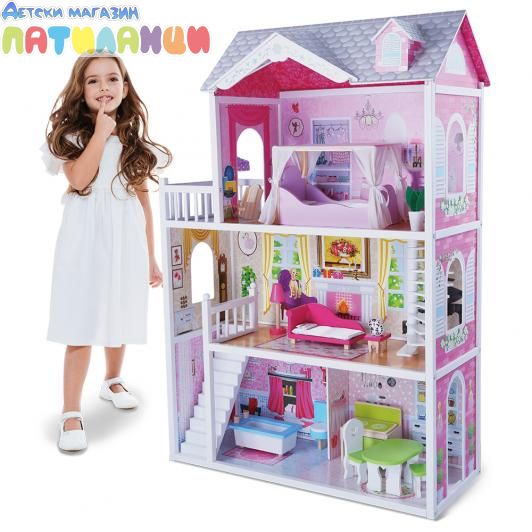 Вашето малко момиче обича да си играе с кукли? Тогава защо не му подарите тази очарователна дървена къща за кукли, която ще очарова най-малките с разнообразни цветове, дизайн и функционалност. Сигурни сме, че още в мига, в който детето я види, ще се влюби в нея. Къщата е на няколко етажа и е разделена на отделни стаи.Дървена къща за кукли, която включва и кукла в комплекта, заедно с 15 аксесоара и мебели за обзавеждане; Къщата е подходяща за кукли с размер до 31см; Размер на сглобената къща е височина 123.50см, ширина 84,00см и дълбочина 38см; За деца над 3 годишна възраст