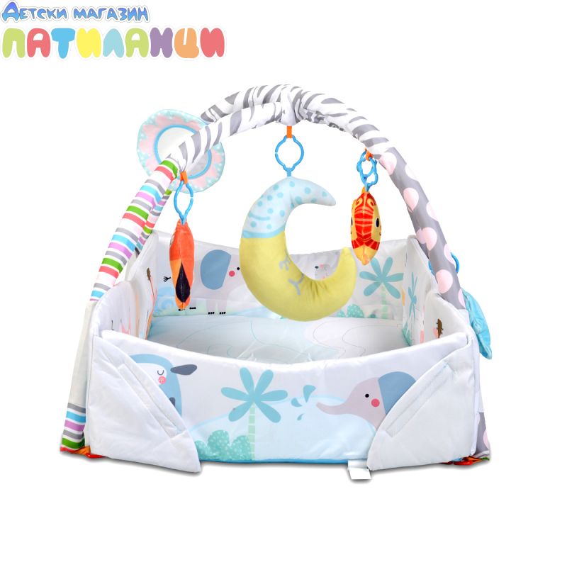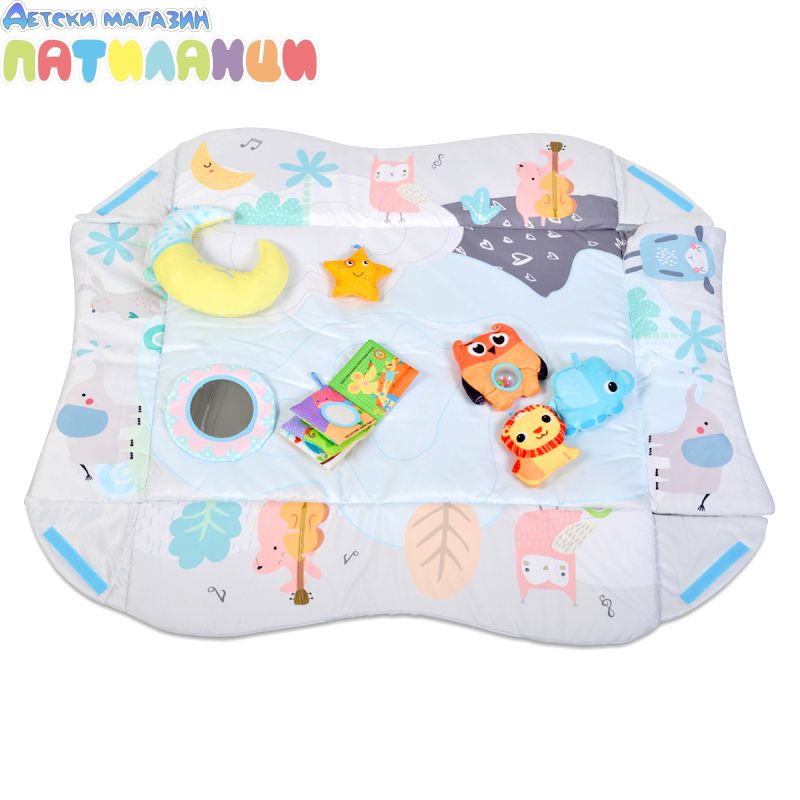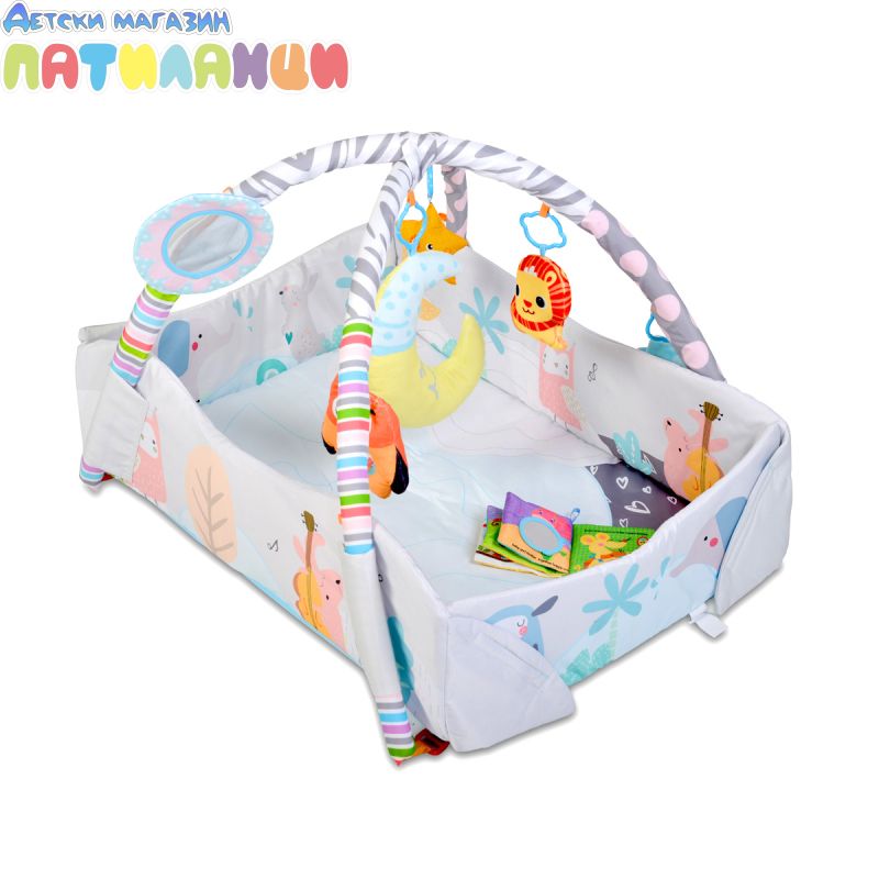 На нея са изобразени цветни, весели животинки, които ще привлекат вниманието на детето. Активната гимнастика има 3 позиции за игра - по гръб, по коремче и в седнало положение с включени в комплекта няколко висящи играчки и сваляеми грифове.