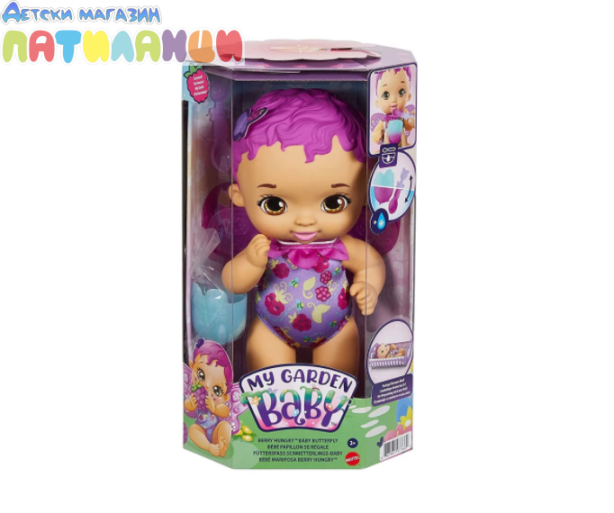 Тази кукла My Garden Baby ™ Berry Hungry ™ Baby Butterfly (30 см.) Е пълна със сладки изненади. Малките ще пърхат от щастието над нейните очарователни крила, фантастична коса и вкусен аромат на малина. „Нахранете“ куклата My Garden Baby ™ с чашата и лъжицата - просто добавете студена вода за забавление с промяна в цвят! За игра с обличане тя се носи всеки път, когато се боди с възхитителни малинки. Плюс това, опаковката се сгъва в креватче, за да можете да помогнете да се внесете в сладки градински сънища! Малките ще обичат да се грижат за своето My Garden Baby ™.