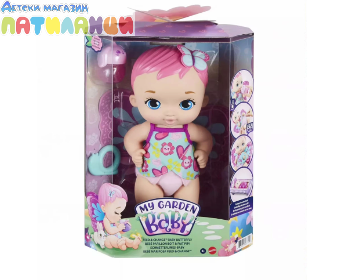 My Garden Baby ™ Feed and Change ™ кукла пеперуда (30.5 см) е класическа игра с кукли бебета! Родена с меки крила, фантастична коса и сладък аромат на жасмин - тази пеперуда просто иска да бъде обгрижвана. Напълнете бутилката с вода, нахранете я, след това сменете памперса от плат за многократна употреба. Тя носи свалящ се топ! За спокойна дрямка крилата се отлепват и стават за одеяло. Плюс това, опаковъчната кутия се сгъва в креватче, където тази пеперуда може да пърха в сладки градински сънища. Малките ще обичат да се грижат за своето My Garden Baby ™!