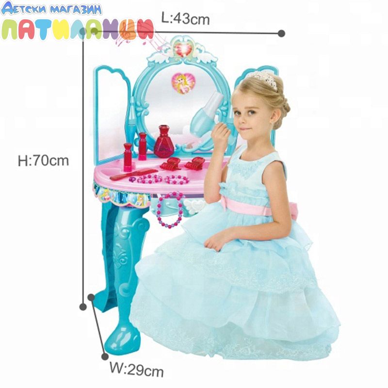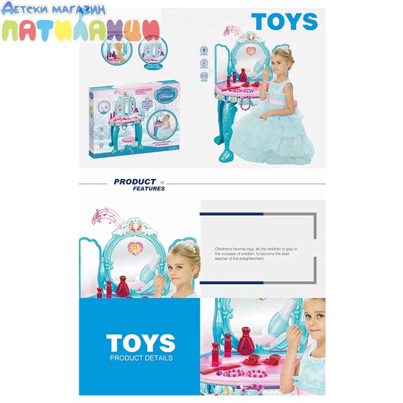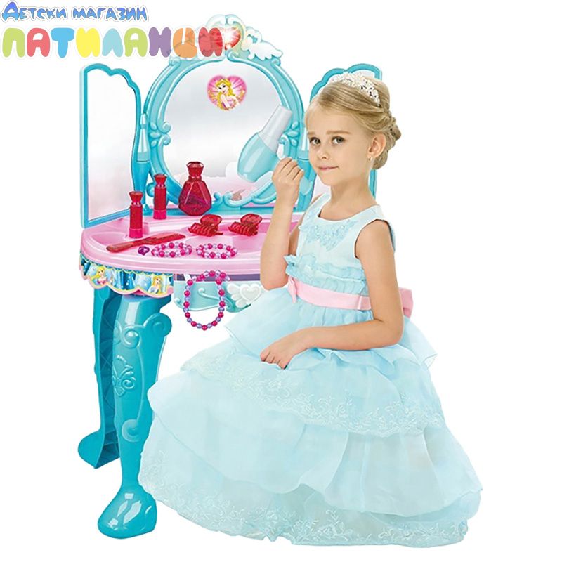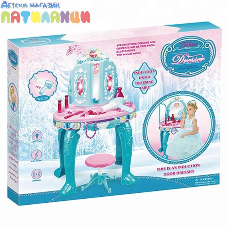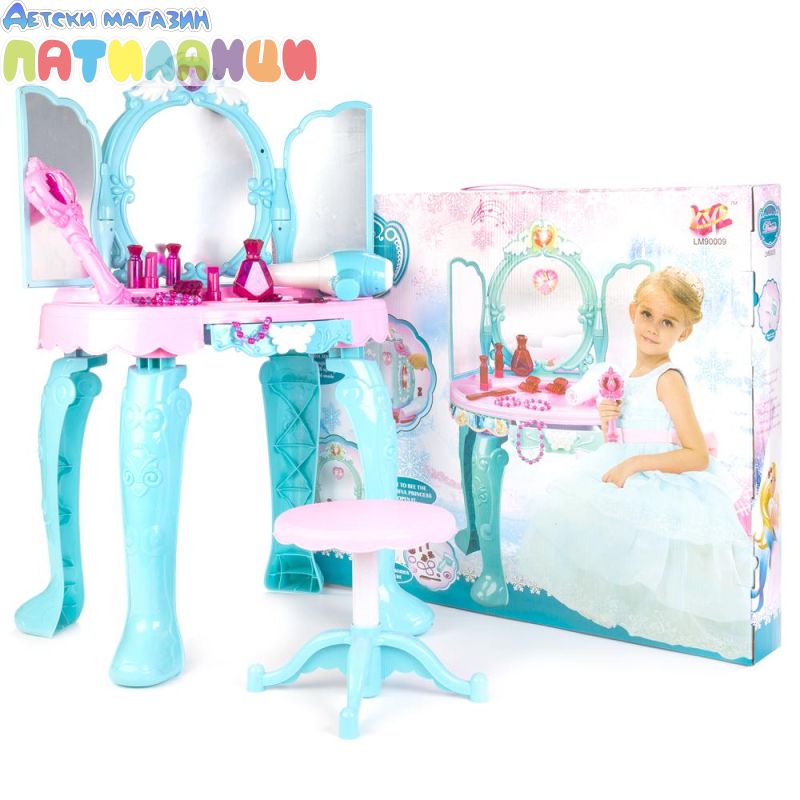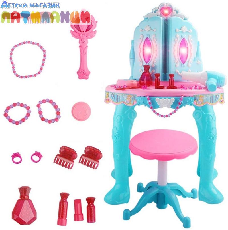 Комплектът съдържа тоалетна масичка, столче, сешоар с реална функция,и аксесоари за красота.