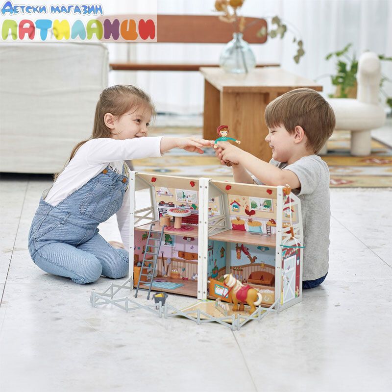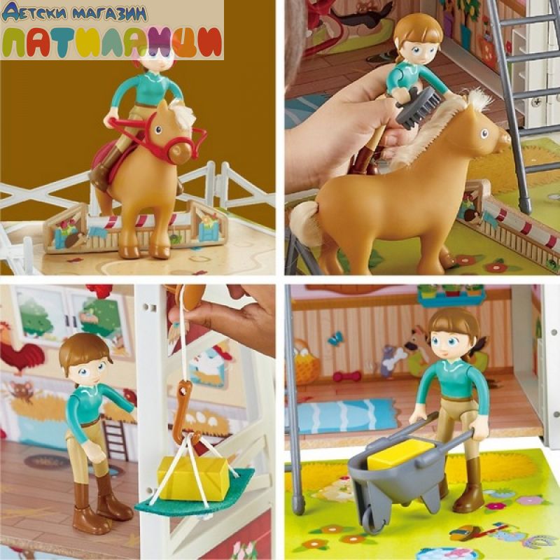 Компактната, лесна за съхранение къщичка е на два етажа и има много аксесоари за игра, включително фигурка на момиче, пони идруги! На долния етаж са разположени конюшнята и помещението за различни принадлежности, а на горния етаж има дневна с кухня, където вашият каубой може да си почине след дълъг ден на езда.