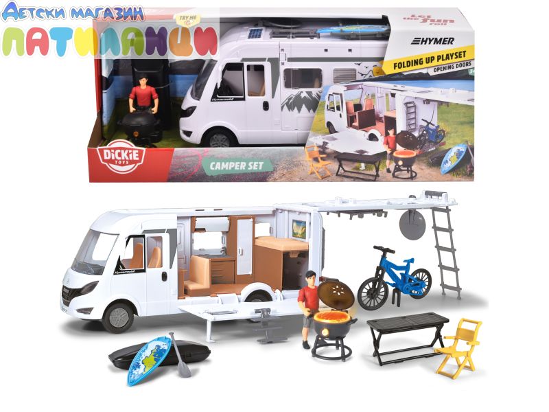 Дики кемпера е един от най-добре оборудваните автомобили в своята категория. Направете пътуване, след като намерите подходящия къмпинг, страничният панел на RV може да бъде сгънат надолу и пикникът може да започне. Пригответе масата, запалете скарата, който иска може да кара сърф. Детайлният интериорен дизайн характеризира играчката за каравана Dickie , която е с мащаб 1:24 и размер 30 см.