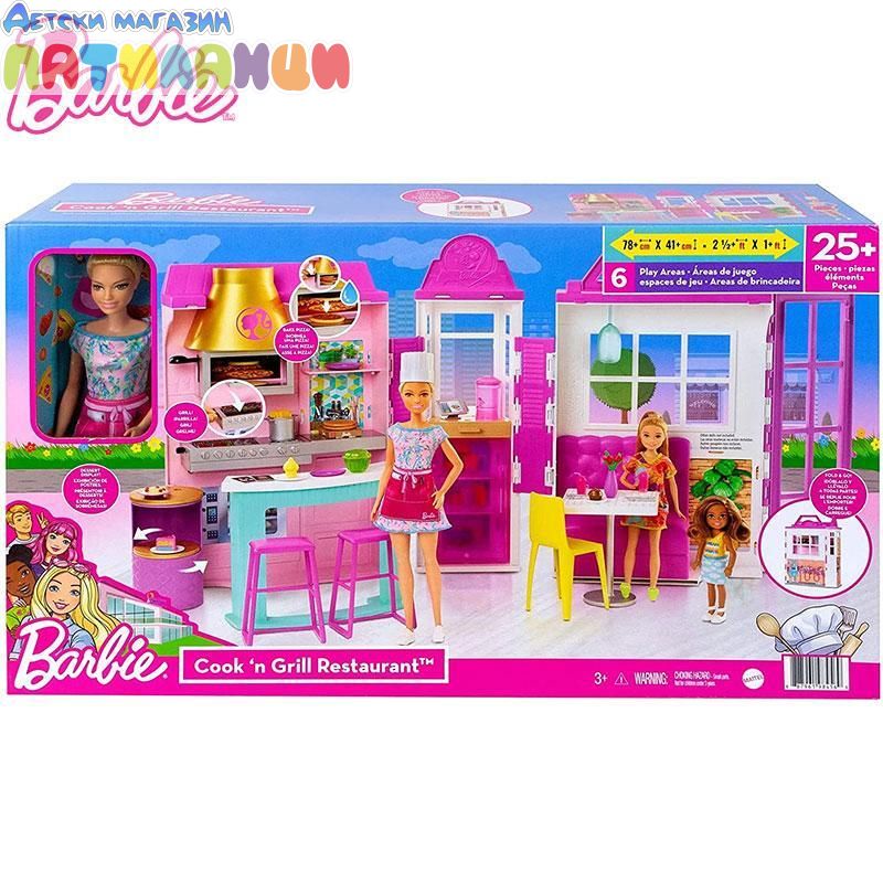 Младите кулинари могат да сервират всякакви забавни истории за разказване с куклата и комплекти за играта Barbie® Cook 'n Grill Restaurant™! С цветен и модерен дизайн, шест зони за игра и общо над 30 части този комплект ресторант разпалва необятното въображение. Куклата Barbie® е готова за работен ден и игри с рокля, очарователна розова престилка и готварска шапка. Децата може да помогне за приемане на поръчки в прозореца или за настаняване до четирима гости в къта за хранене и в мястото за сядане във вътрешния двор. След това се насочва към кухнята, за да приготви бургери на въртящата се скара, да подреди сладките лакомства на въртящата се витрина за десерти и да сложи пица във фурната, която сменя цветете си, когато е „готова“! С повече от 30 части и толкова много възможности за разказване на историята на възрастта над 3 години може да разиграете своята история на Barbie® като готвачи, сервитори, клиенти или трите всеки ден! Куклата не може да стои изправена сама. Цветът и декорацията може да се разделят.