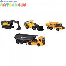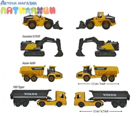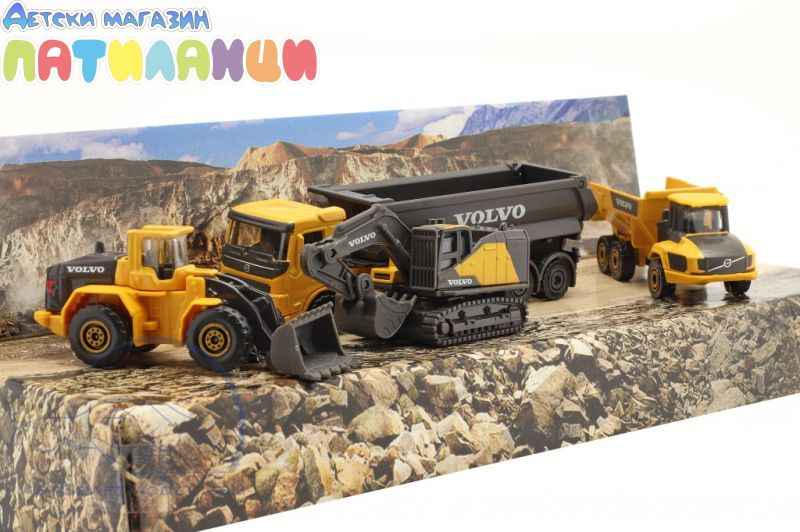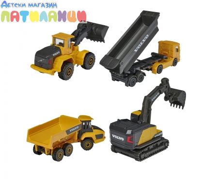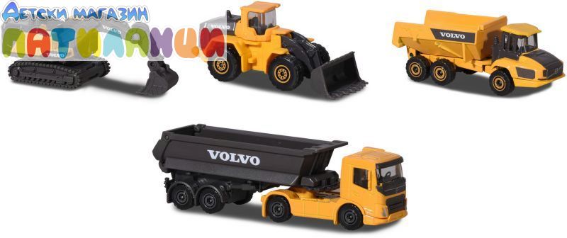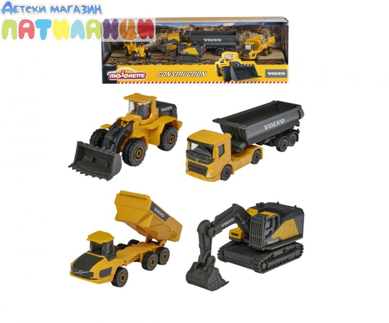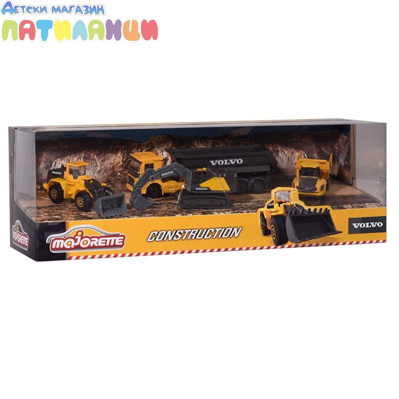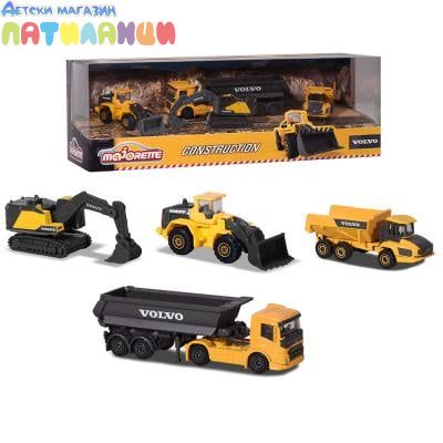Комплектът от "Majorette" ще зарадва всеки любител на строителните машини. Той съдържа 4 строителни машини Volvo, изработени от метал и пластмаса. Играчките са с приблизителна дължина 7 cm и измежду тях ще намерите умалени модели на самосвал, камион с ремарке, багер и фадрома. Специално внимание е обърнато на детайлите на всяка от тях, а освен това лопатите, каросериите и веригите могат да се спускат нагоре и надолу и да се движат напред и назад.