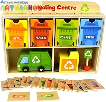 Този дървен център за рециклиране, оцветен в ярки цветове, веднага ще привлече вниманието на вашето дете.
