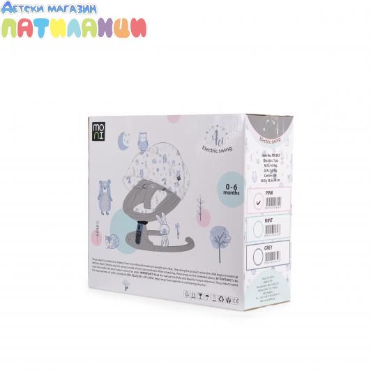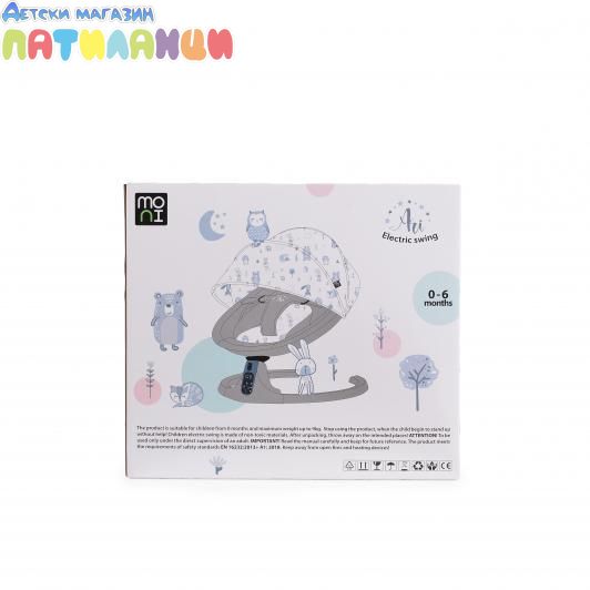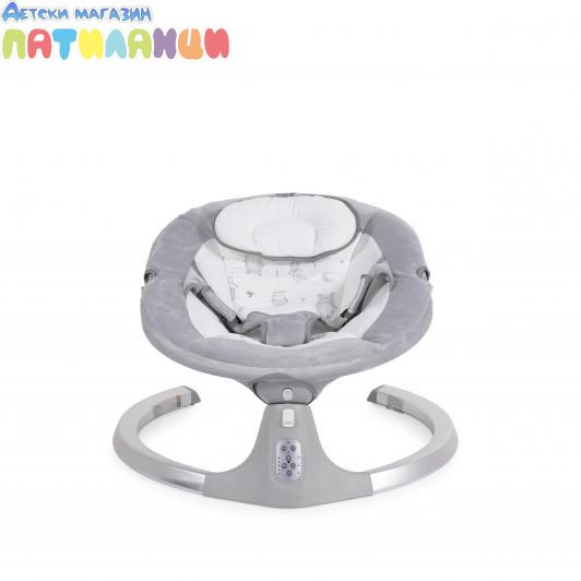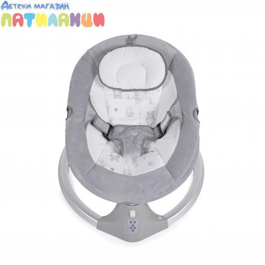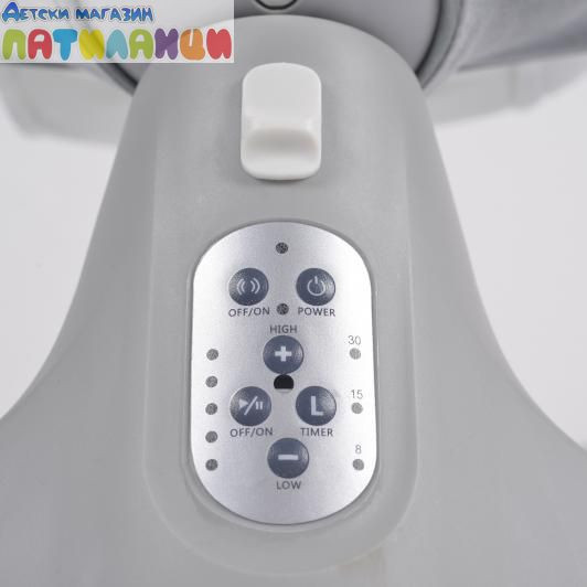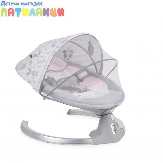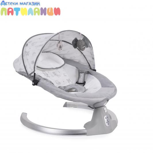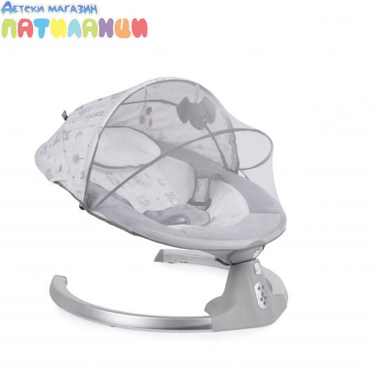 Има 5 скорости на люлеене, таймер с 3 времена, 12 прекрасни мелодии, 3-точков колан, сенник с мрежа против насекоми с 2 меки играчки и функция “шезлонг“ при застопоряване на механизма. Тапицерията може лесно да бъде свалена.