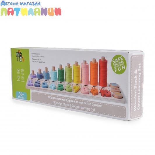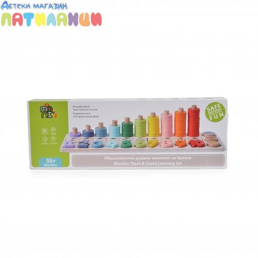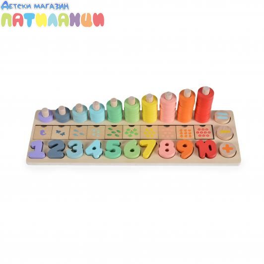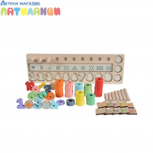 Пакетът съдържа: образователна дървена игра Abac с различни по цвят пръстени, дъска, парчета и колони (височината на колоните се увеличава с броя, който представляват). Парчетата се състоят от две части (тип пъзел), парчета, номерирани с цифри от 1 до 10 и парчета с фигурки, съответстващи на номера, и двете парчета са представени на дъската, помагайки на малките да научат цифри, развивайки визуалната им памет, но също така и добре моторни умения.