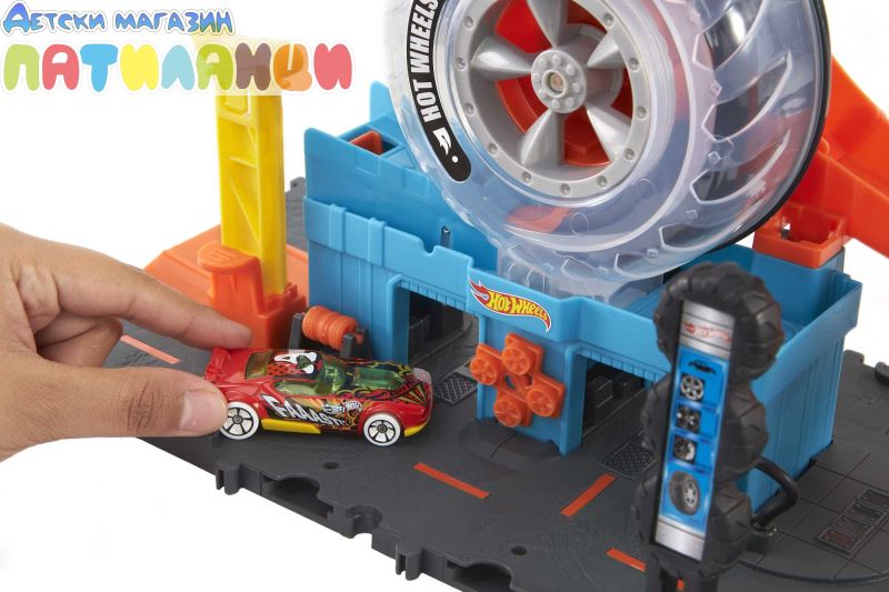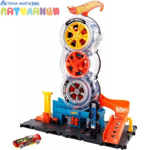 Децата се справят с множество завои в Hot Wheels™ City Super Twist Tire Shop™, докато въртят централния ключ и движат колите си през полупрозрачните колела на магазина. След като стигнат до върха, те се спускат надолу по рампата и се отправят към нови приключения. Основата на комплекта за игра се свързва с други комплекти Hot Wheels® и може да се използва с допълнителни парчета за писта Hot Wheels®, така че децата да могат да изградят свят за състезания по свой собствен дизайн (допълнителни комплекти и писта се продават отделно). Включен е един автомобил Hot Wheels®, но до четири могат да преминат през структурата на гумата наведнъж (допълнителни коли се продават отделно). Реалистичните детайли като движещ се с помощта на децата асансьор и газова помпа подобряват възможностите за разказване на истории. Цветовете и декорациите могат да варират.