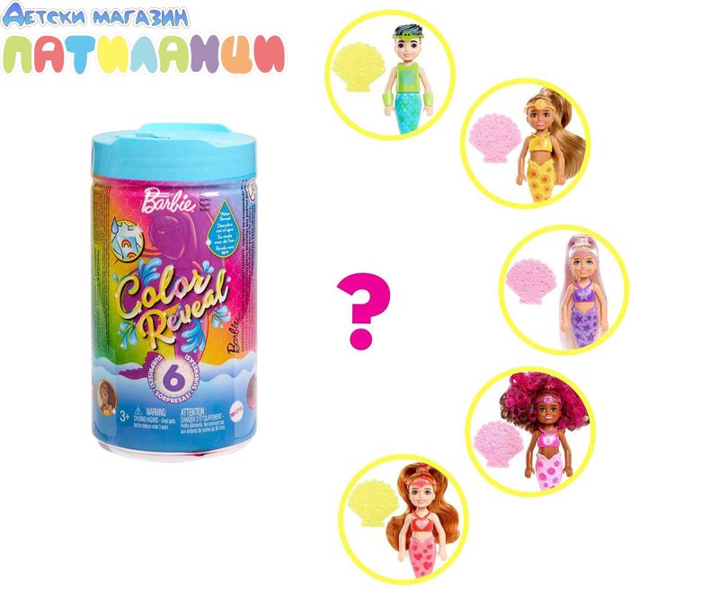 Куклите Barbie® Color Reveal™ доставят изживяване при разопаковане, пълно с изненади - цели шест! Кукла Chelsea™ с цветна опашка на русалка е гарантирана, но външният вид на всяка кукла остава загадка, докато не бъде разкрит. Опаковката е част от забавлението - издърпайте лентата, за да премахнете външния слой и да разкриете прозрачна тръба. Вътре има кукла русалка Color Reveal™ Chelsea™, чиято пълна визия е скрита зад метално морско синьо и покритие с дъга, и четири пликчета с изненади. Отстранете всичко и напълнете епруветката с топла вода, след това поставете куклата и завъртете. Водата става блестящо морско синя, а когато куклата бъде извадена, чертите й се разкриват! Всяка кукла русалка Chelsea™ представлява различен цвят на дъгата с дълга коса с цветни нишки и шарена опашка, а изненадите продължават... отворете пликчетата, за да откриете горнище с щипки, маншети на китките, корона/лента за глава и гъба с вид на мида. Ефектите за промяна на цвета върху опашките на куклите допринасят за изненадата и забавлението. Всяка серия има уникална тема - тези кукли Color Reveal™ Chelsea™ са свързани с дъги и русалки. Използвайте тръбата, за да съхранявате тези и други любими кукли. Коя кукла ще разкриеш? Децата могат да ги събират, за да смесват и съчетават аксесоари и да разширяват възможностите! Куклите не могат да стоят сами. Цветовете и декорациите могат да варират. Характеристики: С 6 изненади в 1 пакет, куклите Barbie® Chelsea™ Color Reveal™ доставят всякакъв вид наслада - децата ще обичат да разкриват серията Rainbow Mermaid с оригиналната иновация Color Reveal™!