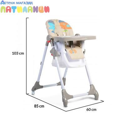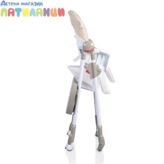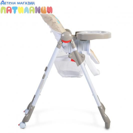 За максимално удобство и комфорт по време на хранен, столът има 5 степени за регулиране височината на седалката.Към двойната табла за хранене има поставка за шише или чаша. Горната й част се сваля и почиства без да има нужда да се откача основата на таблата;