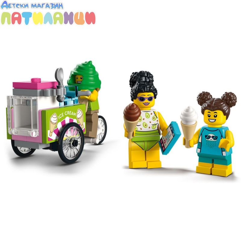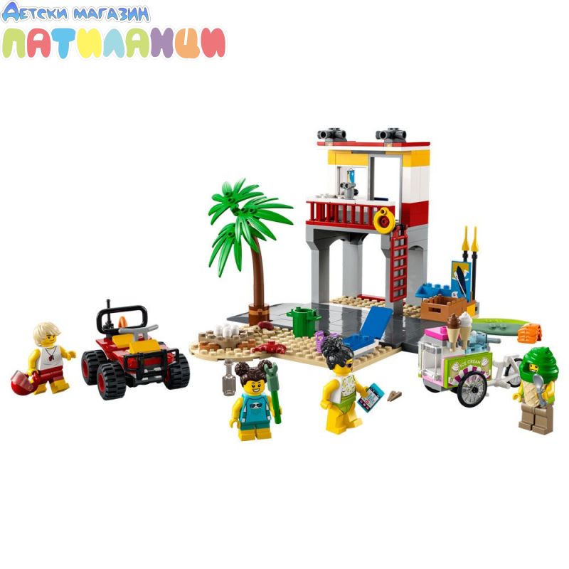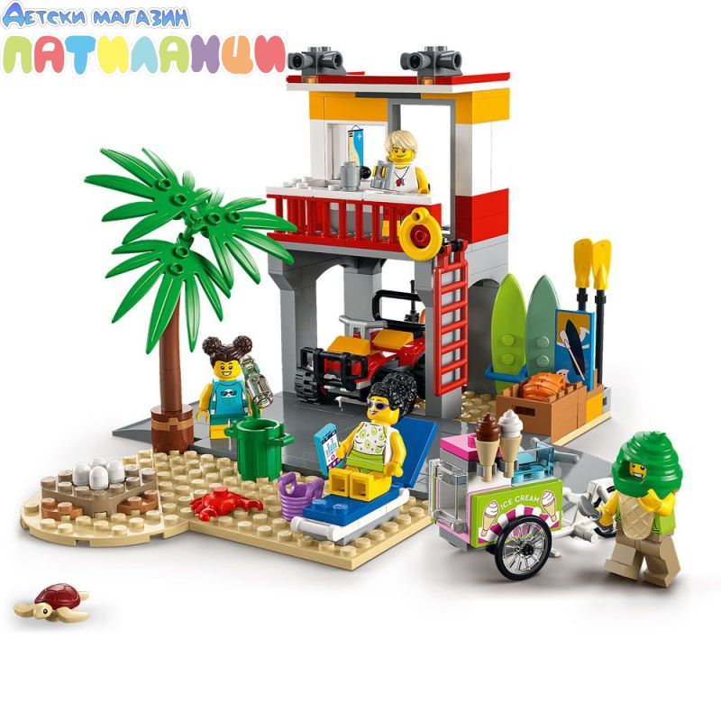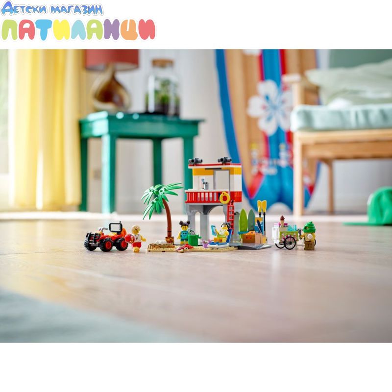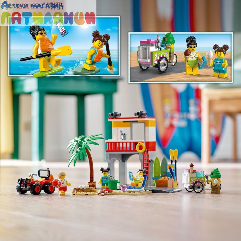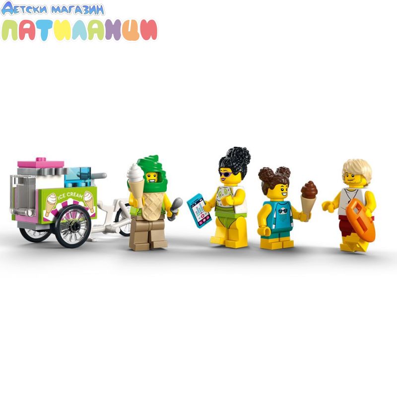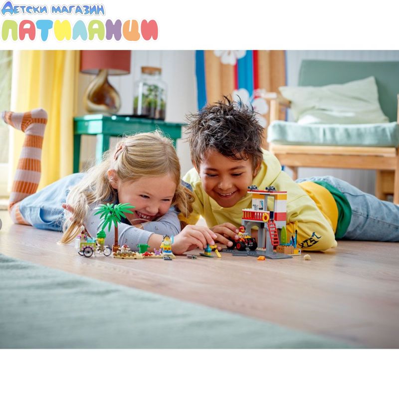 Слънчев ден на плажа. Купете студено лакомство от продавача на сладолед в неговото забавно облекло или вземете спасителна жилетка и опитайте сърфа с гребло... но внимавайте за рака! След това помогнете за почистването на плажа, където гнезди морска костенурка, преди да се отправите към спасителната станция, където ще намерите чудесно ATV и много страхотно оборудване за опазване на безопасността на плажуващите в LEGO® City!