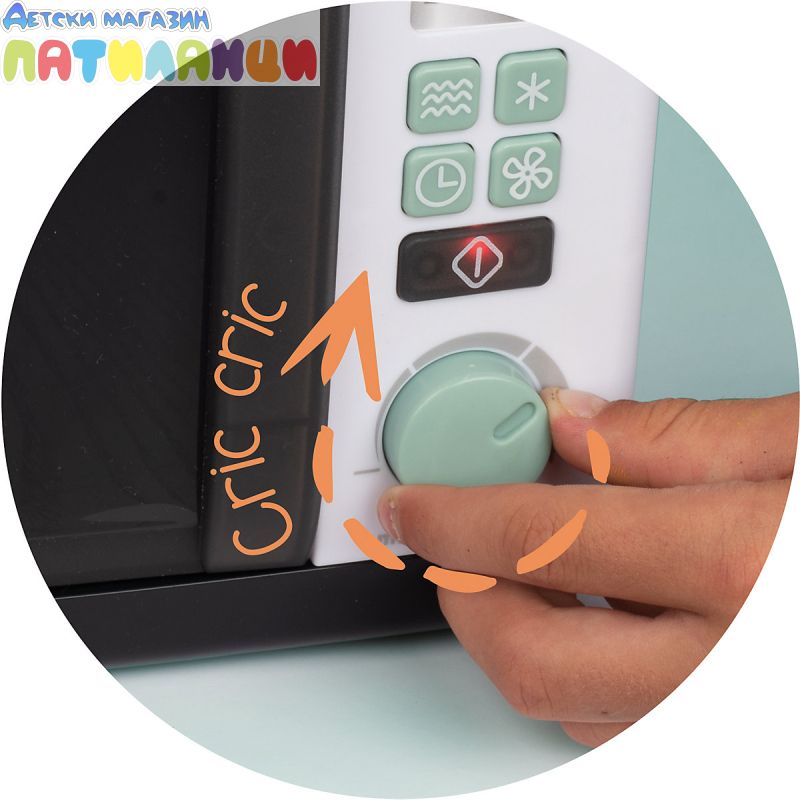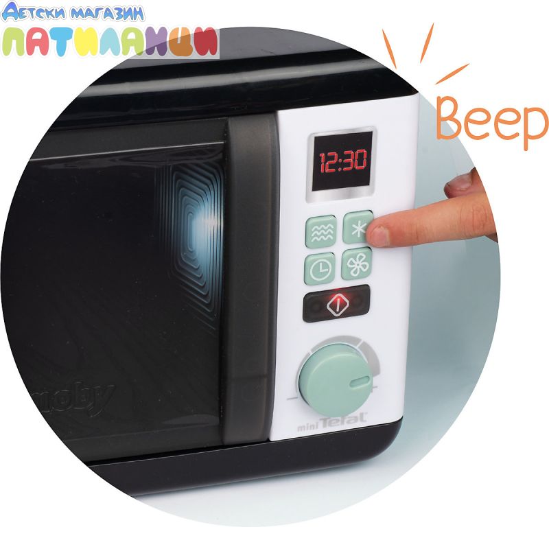 Тази микровълнова фурна Tefal от Smoby впечатлява с оригиналния си дизайн и не бива да липсва в нито една детска кухня. Натискането на бутоните задейства различни звукови и светлинни функции. Освен това въртящият се превключвател издава механичен щракащ шум.