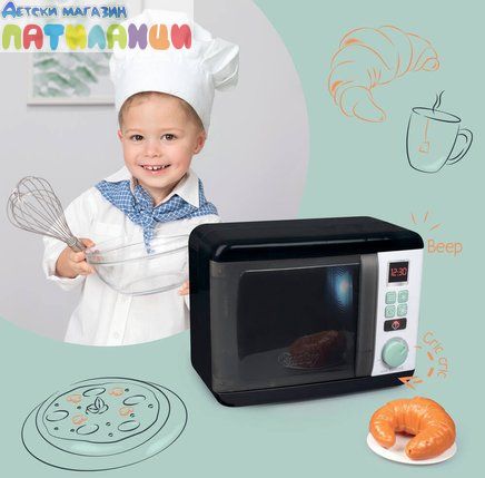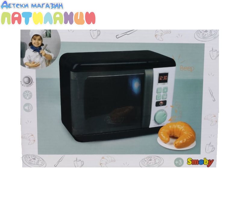 Задължителна част във всяка детска кухня: електронната микровълнова печка Tefal от Smoby. Играчката в оригиналния дизайн на Tefal убеждава с удобни за децата функции: различни светлинни и звукови функции могат да се задействат чрез бутоните, въртящият се превключвател издава механично щракане. Доставката включва чиния и кроасан. Работа с батерии: 2x LR6/AA миньон батерии (включени). Размери на продукта ДхШхВ: 24х 13х 18,5 см. Препоръчителна възраст: подходящо за деца от 3 години