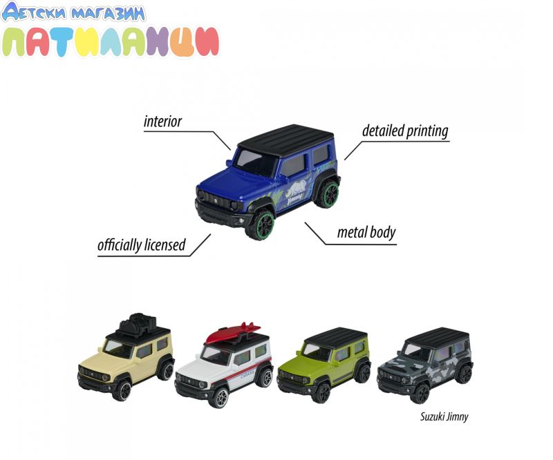 Подобрете колекцията си с тези зашеметяващи отляти модели! Всеки от 5-те модела е със сложен дизайн и гарантирано ще бъде експонат във вашата колекция. Офроуд отлятите превозни средства са лесни за управление и разполагат с въртящи се колела и следователно също са отлична играчка за по-младите фенове на Jimny на възраст 3 и повече години.