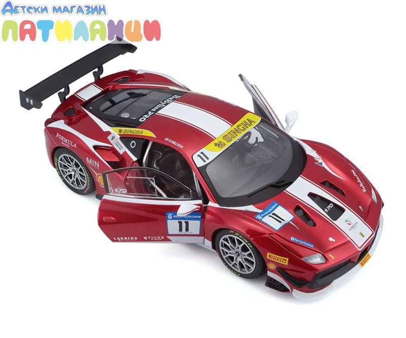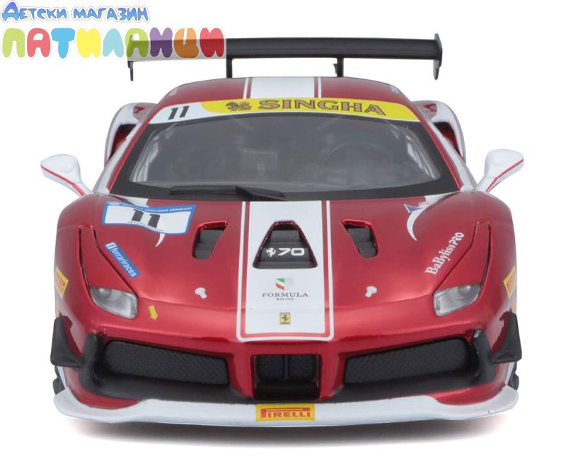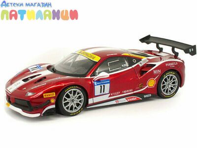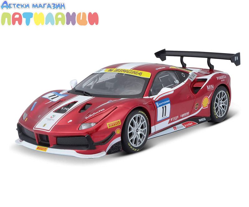 Метална кола Ferrari 488 Challenge #11 Bburago 1:24, 18/26308. Едва ли има сериозен любител на die-cast количките, който да не разпознава името „Bburago”. Днес това е един от водещите производители на висококачествени метални реплики на някои от най-популярните и грабващи окото модели автомобили. Модерни, класически, спортни, представителни, изискани – умалените копия пресъздават в детайли дизайнът на оригиналите и впечатляват с достоверност и прецизност. Мащаб: 1/24 Възможни са цветови вариации. Доставка според наличностите. Подходящо за деца над 3 години