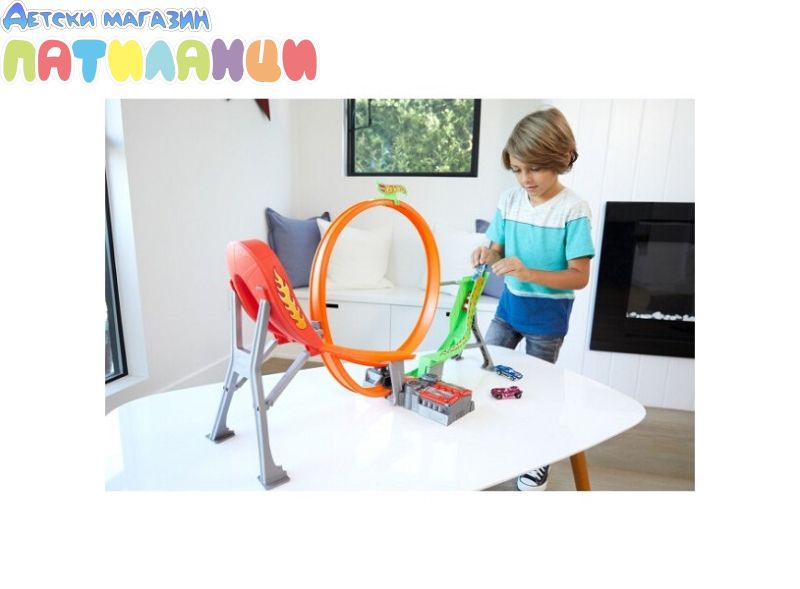 Готови ли сте за предизвикателството Hot Wheels с тази моторизирана писта с лупинг и изстрелвачка?!