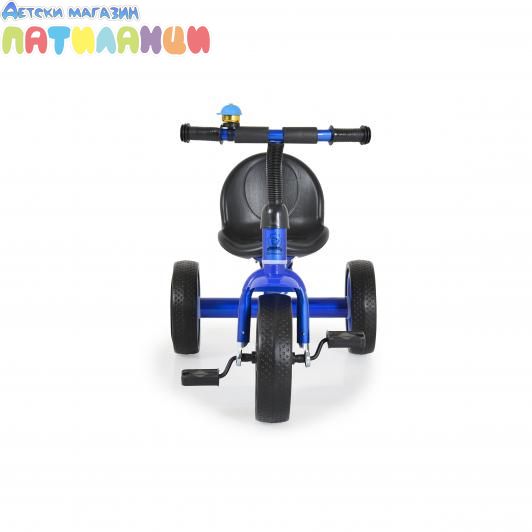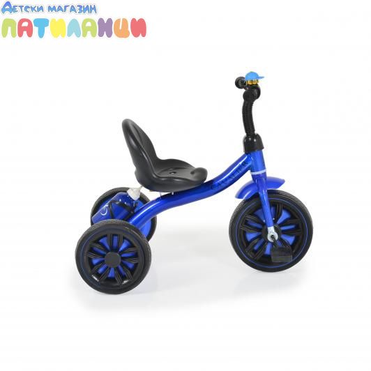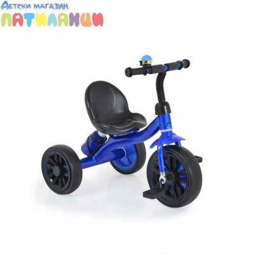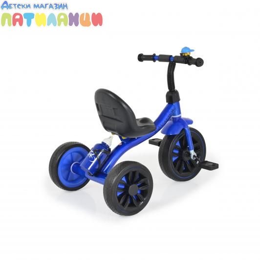 Детска триколка със звънец Cavalier LUX, СИН. За употреба от деца на възраст над 3 години и с максимално тегло до 25 кг. Продуктът е с меки EVA гуми, удобна седалка, метално звънче и шише за вода с поставка.