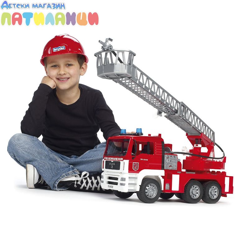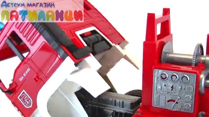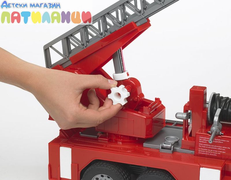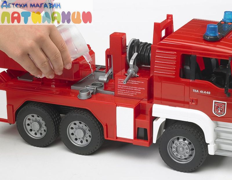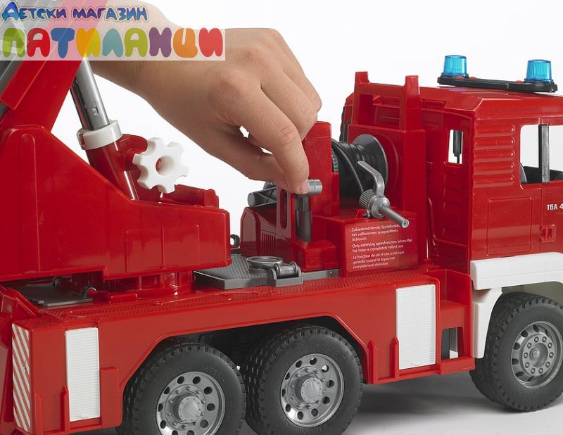 Пожарният камион MAN има мигащи светлини със сирени и функционален маркуч за вода, който създава изпълнено с екшън забавление! Тази уникална пожарна машина има резервоар за вода с истинска водна помпа и разтегателна стълба с накланяща се кошница за маркуч за пожарникар. Точно като истински! Маркучът се навива и се прибира в задната част на кабината на пожарната машина. Пожарната кола има регулируеми странични огледала, а кабината се накланя напред, за да разкрие двигателя. Стълбата на пожарния камион MAN се върти на 360 градуса и има подвижни стабилизиращи крака, които щракват на място.