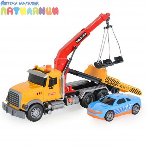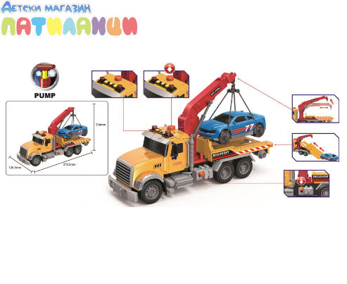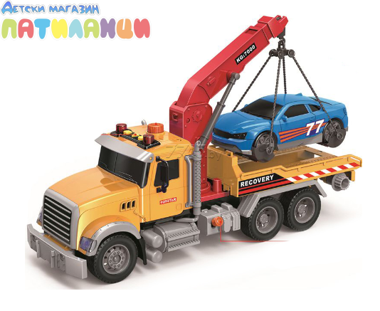 Камион пътна помощ ще бъде чудесен подарък за млад автомобилен ентусиаст. Характеристики на модела: повдигащ манипулатор, подвижна платформа, звукови ефекти (сирена, звук на работещ двигател), светлинни ефекти. Тегличът е оборудван с инерционен двигател, пътува без батерии, трябва само леко да го дръпнете назад и да го освободите. Благодарение на инерционния механизъм теглещият камион може бързо да ускори до висока скорост за кратък период от време. Комплектът включва играчка кола. Размер на теглича: 36.6x23.4x37.9 см. Захранване: 3 батерии AG13 (включени).