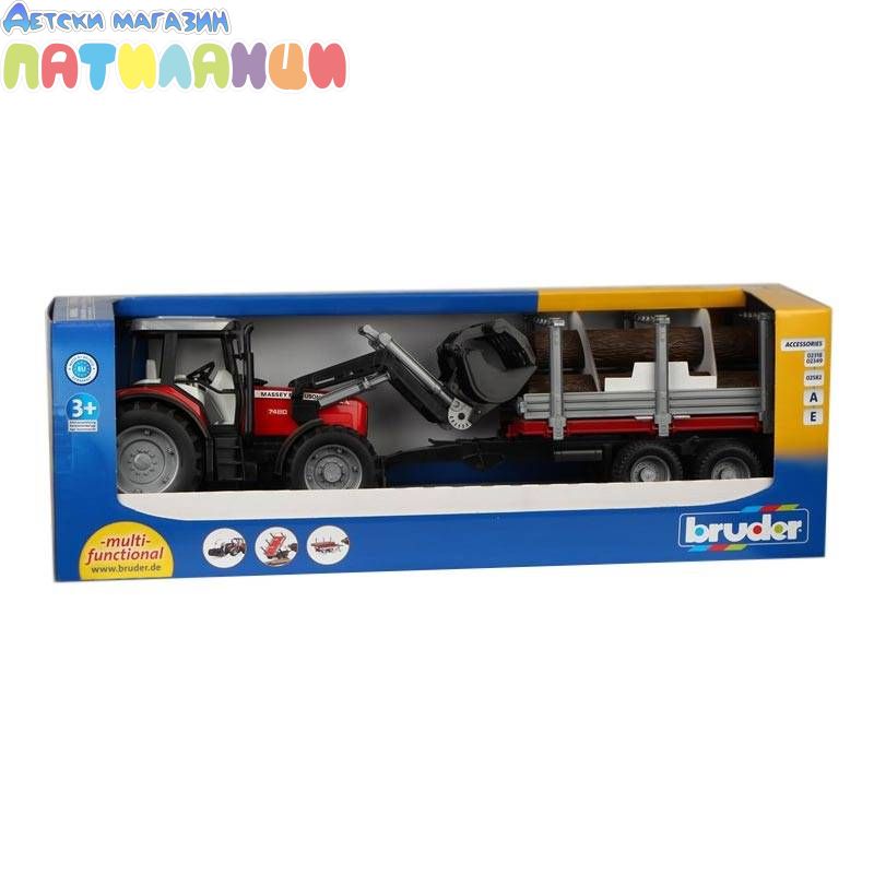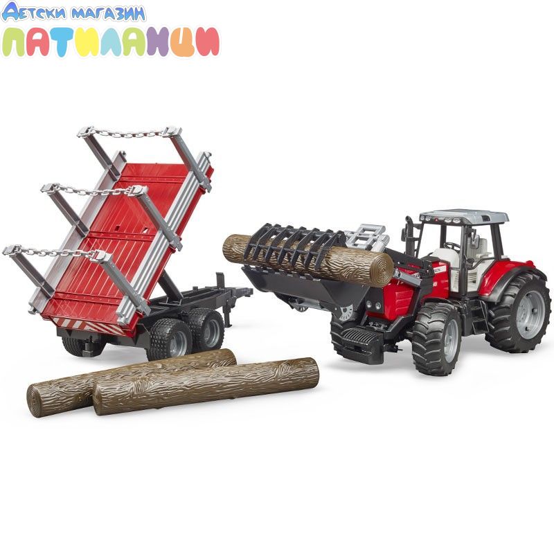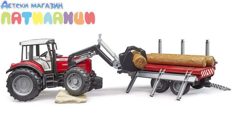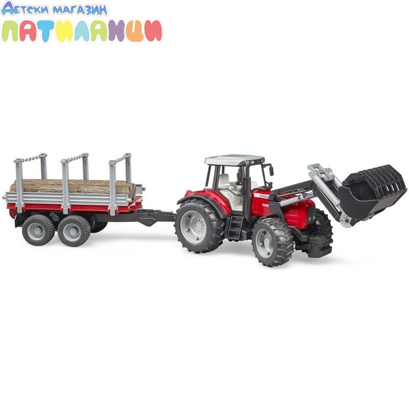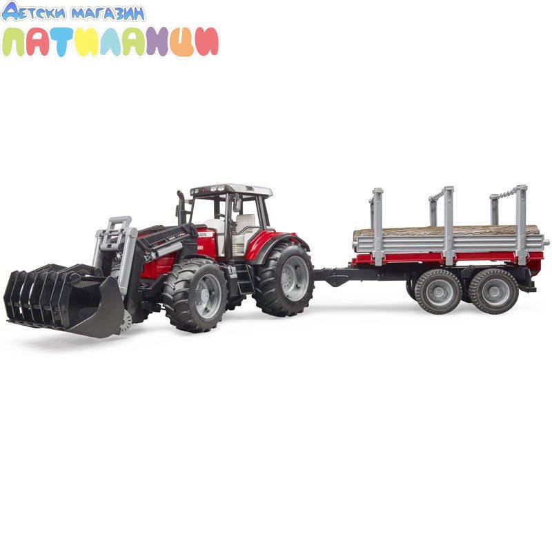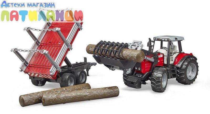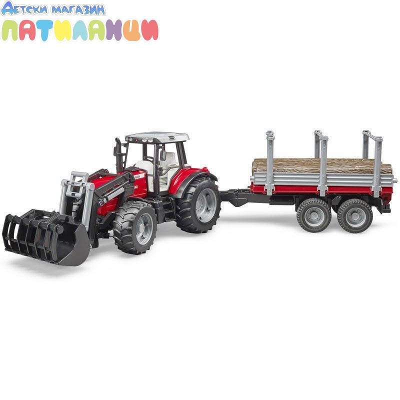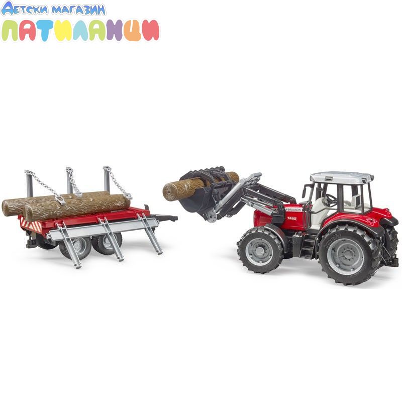 Трактор с челен товарач и ремарке за дървен материал MASSEY FERGUSON 7480 BRUDER 02046