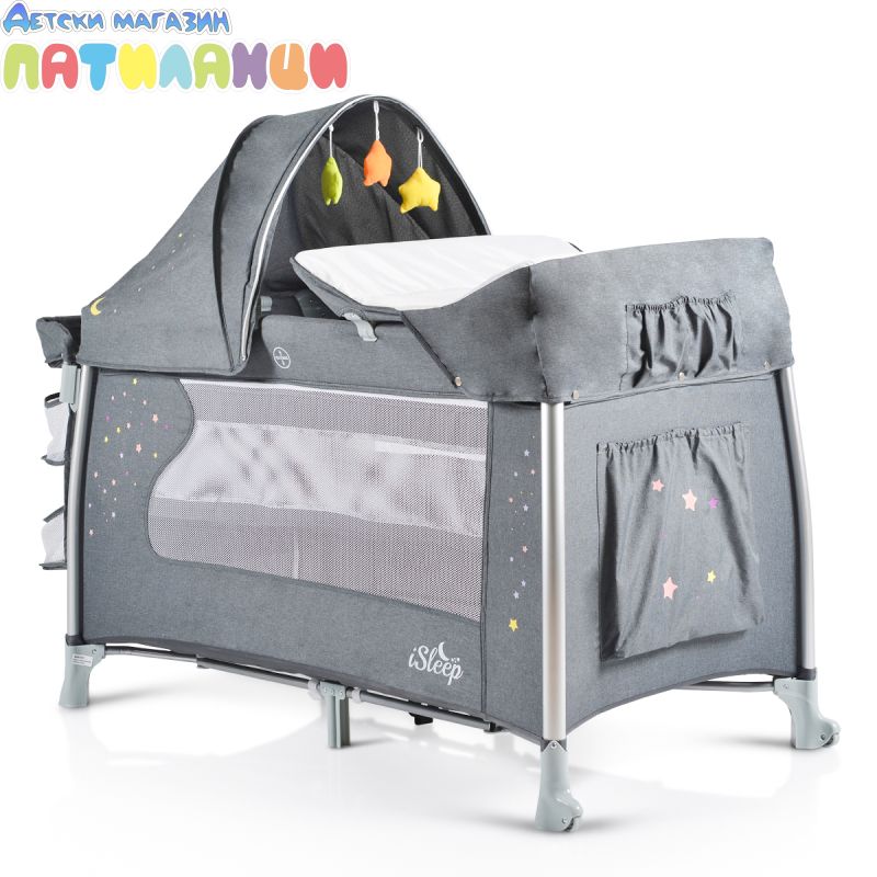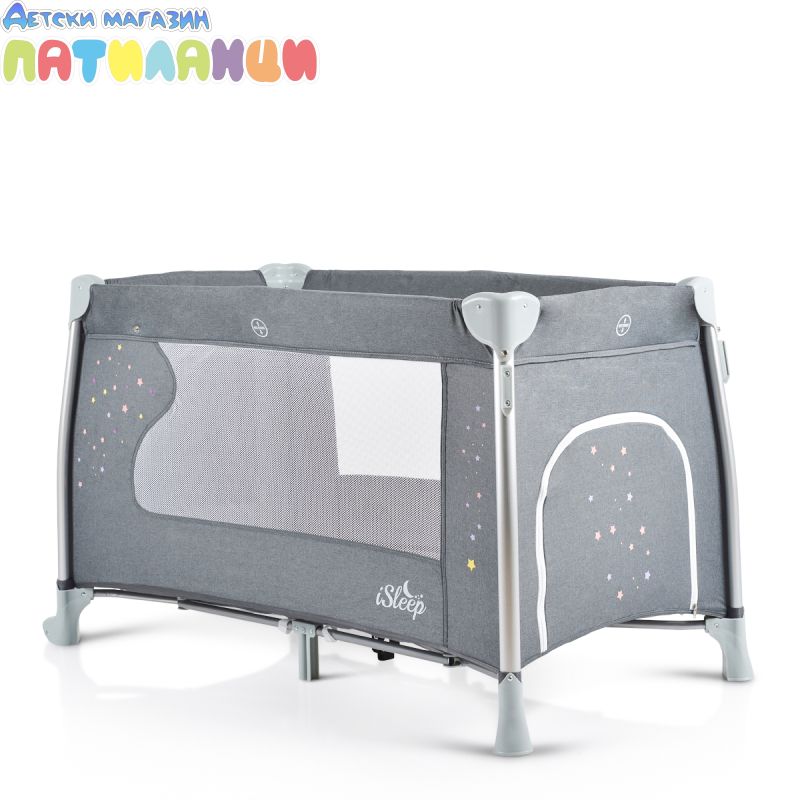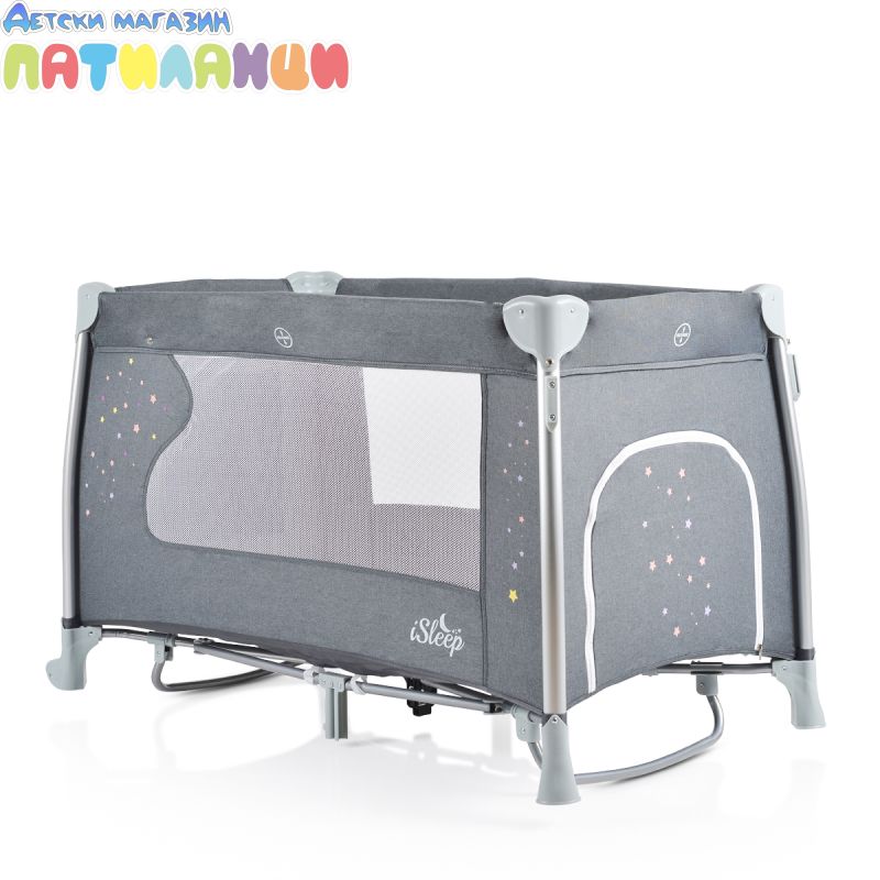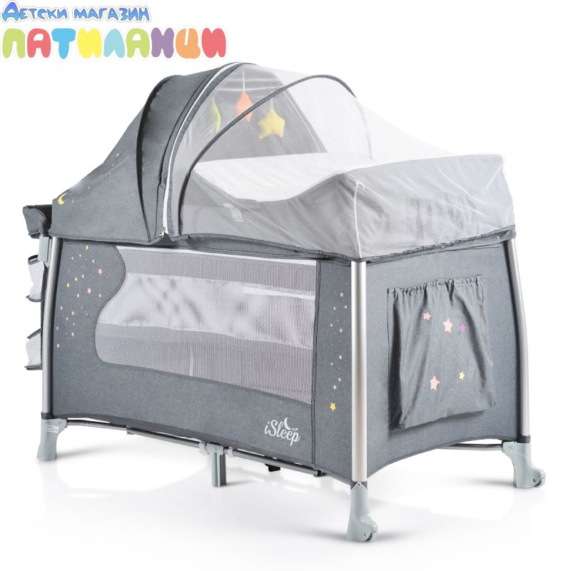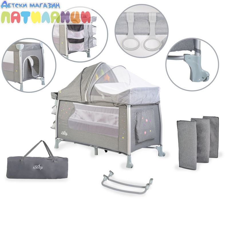 Кошарата ISleep разполага със странични джобове за играчки и аксесоари, както и със сенник с предпазваща мрежа против насекоми. За да може бебетата да се забавляват от сърце, към сенника има закачени 3 играчки.Кошарата е с люлеещ се механизъм и поддържа максимално тегло от 14 килограма.