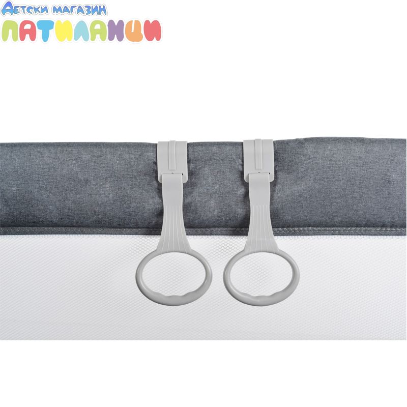 Детската кошара е изработена от специална ленена материя с гарантирано качество и има 2 колелца, които помагат за по-лесното й преместване.