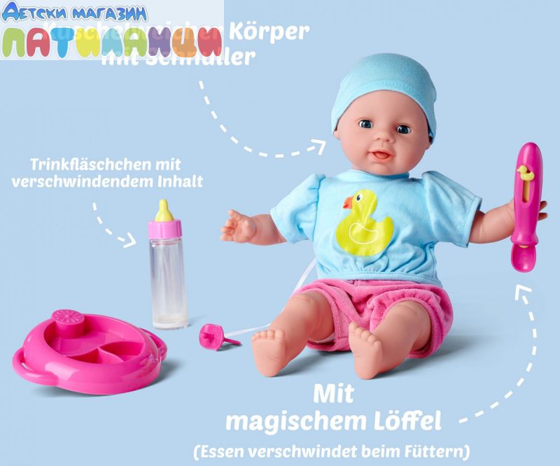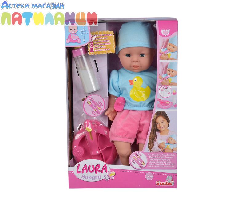 Сладката малка Лаура наистина е гладка и с нетърпение очаква да бъде нахранена. Комплектът Гладна Лаура включва 38 см висока кукла с меко тяло, вълшебна лъжица, върху която храната изчезва, когато я нахраните, бутилка с изчезващо мляко и чиния. Подходящо за деца на и над 2 години.