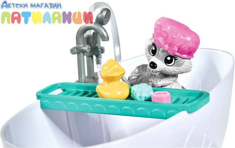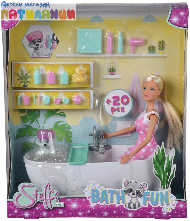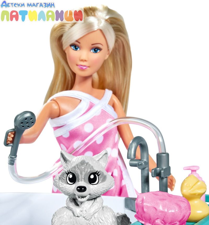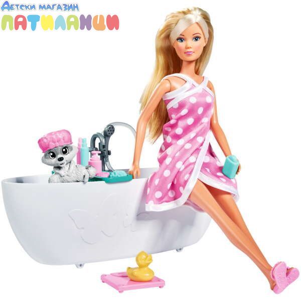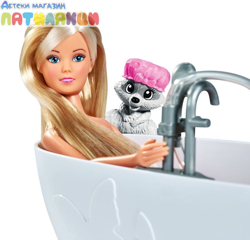 Забавлявайте се със Стефи и нейното сладко кученце. За да бъде играта вълнуваща и интересена ще получите редица аксесоари като вана, сапунчета, сешоар и други.
