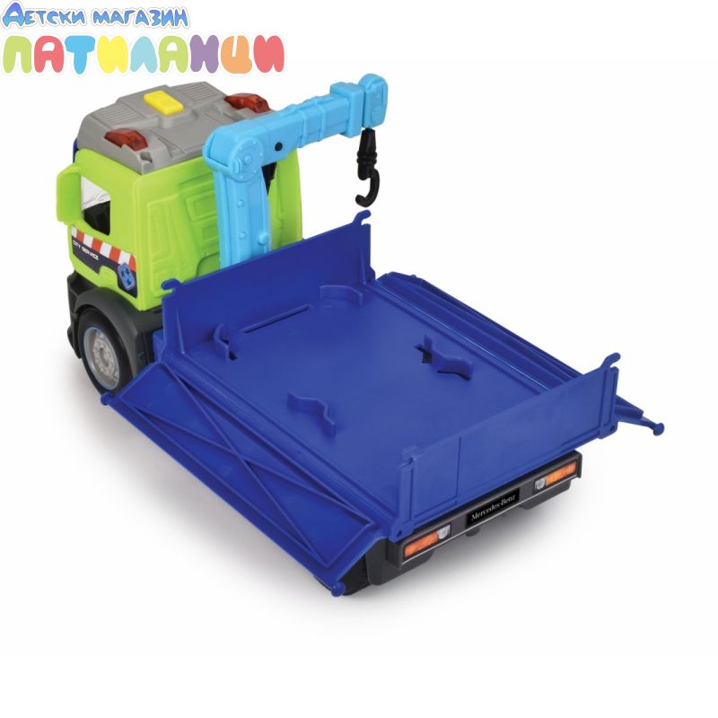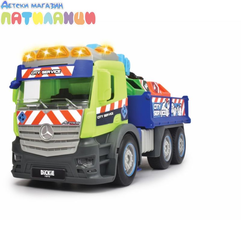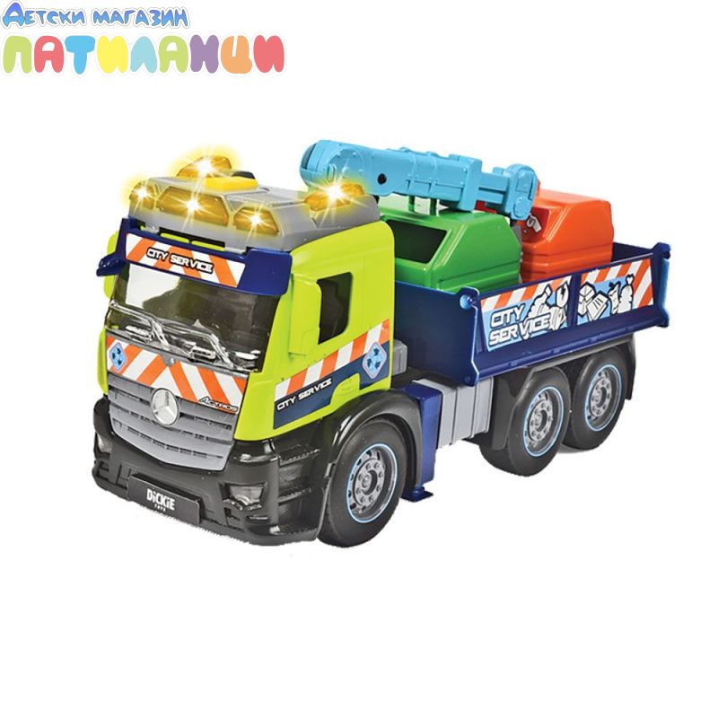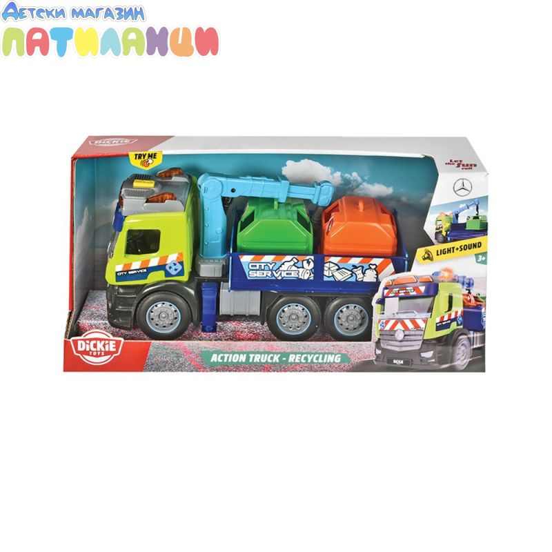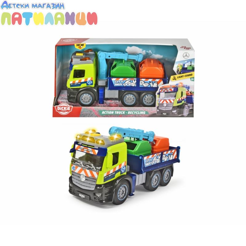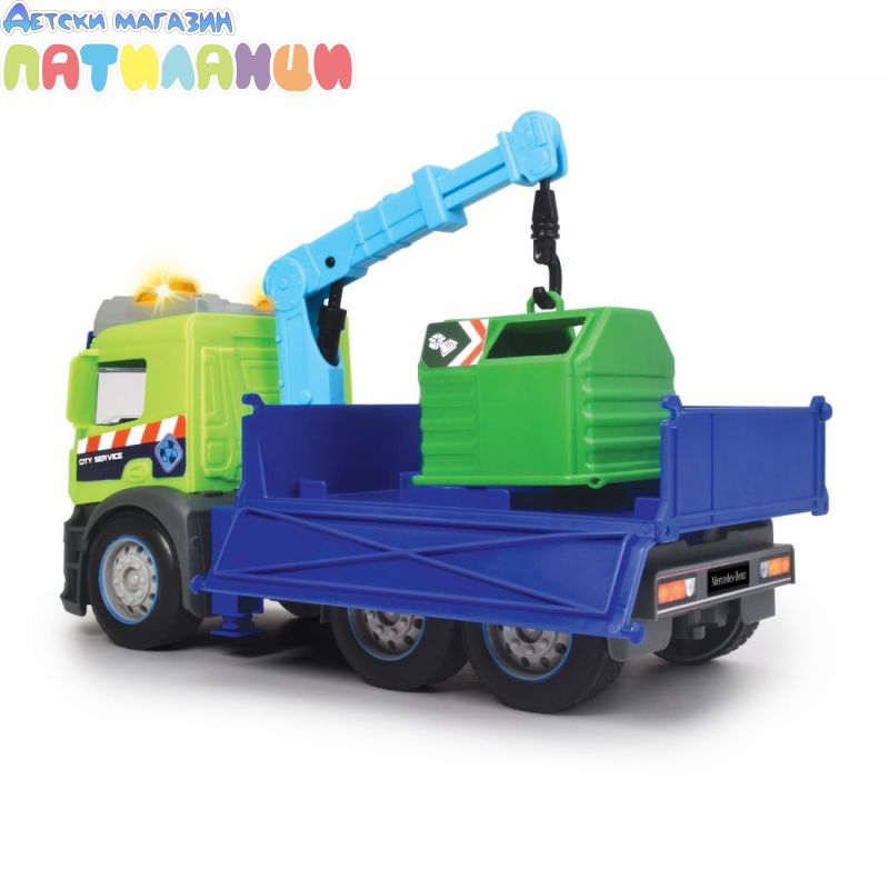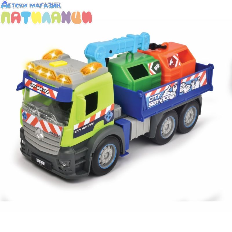 Представяме Ви Камион за рециклиране на боклуци с кран, звукови ефекти, предупредителна светлина и функция товарене - разтоварване. Камиона е по модел на Mercedes Actros  с голямо лого. Работи с батерии 2 хААА.