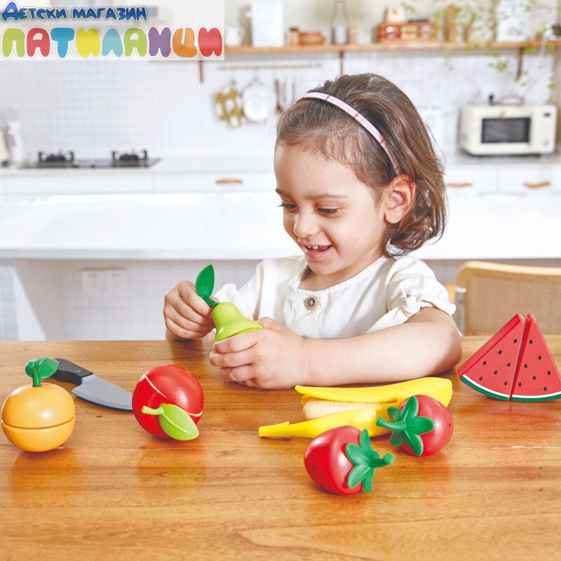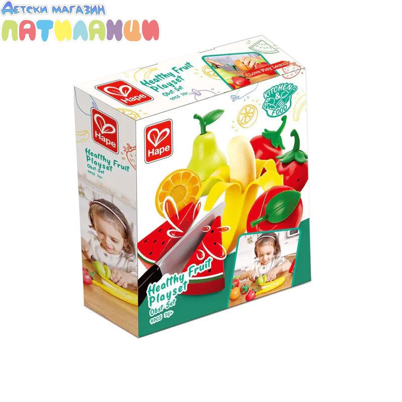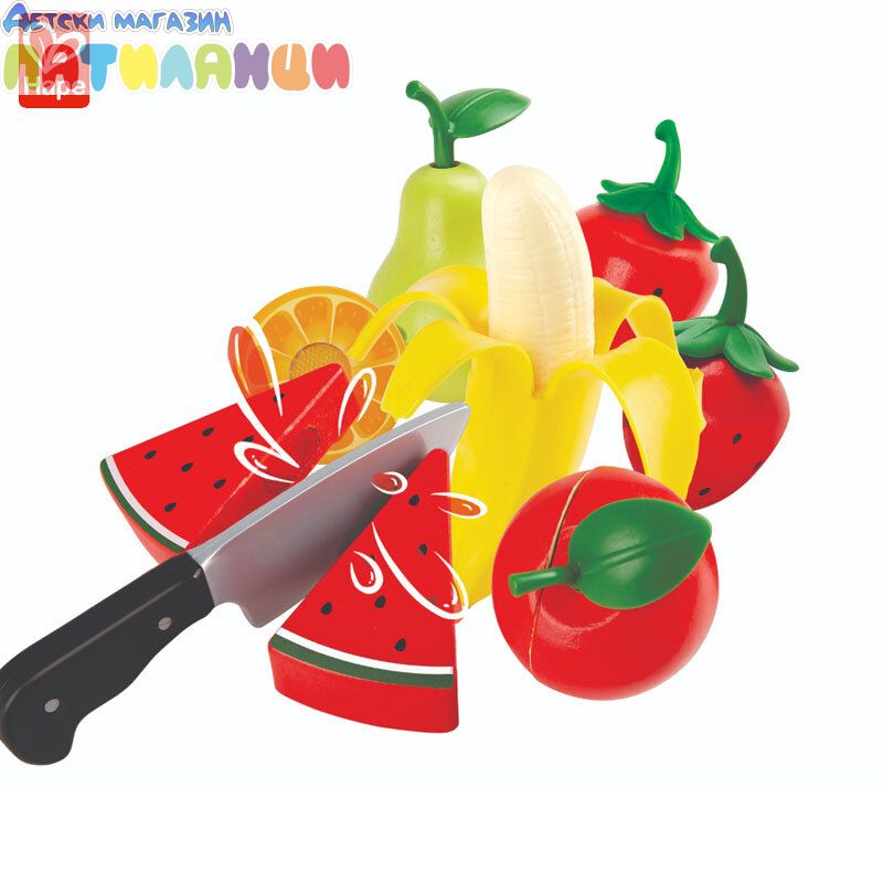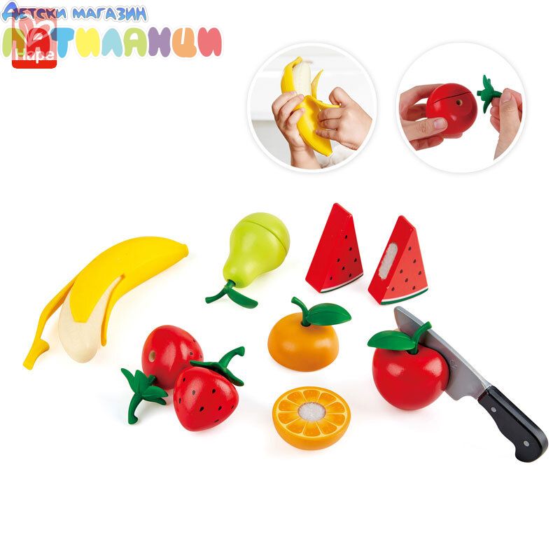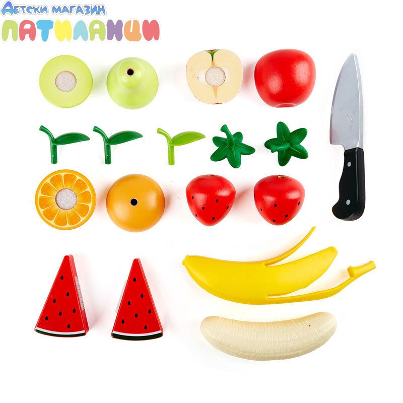 Включва един реалистичен нож за игра, две ягоди, една круша, един портокал, един банан, една ябълка и един резен диня. Всичките те могат да бъдат нарязани с дървения нож.