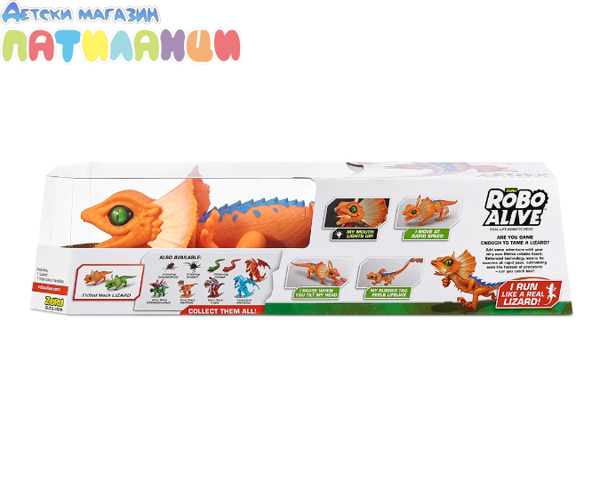 Новият Робо-гущер е повече от реалистичен, Той е като истински! Този гущер се движи и тича като истински гущер с истински очи, подвижни ръце и крака и светеща уста. ROBOT LEZARD Този гущер идва с вградени сензори, сензорът във вратата спира движението. Докоснете меката гумена глава и опашка за истинско усещане. Усъвършенстваната технология на Robo Alive вдъхва живота на този гущер! Съчетавайки висококачествена технология с реалистичен дизайн, този гущер е RoboAlive! Детска игра: 1 x Дебнещ гущер 1 x Ръководство с инструкции ROBO ALIVE: Robo Alive предлага функционални роботизирани домашни любимци, които се движат и се държат като истински! Те са повече от живи - те са Robo Alive.