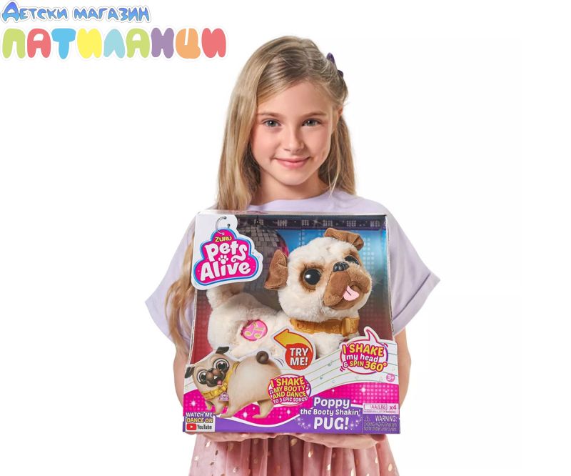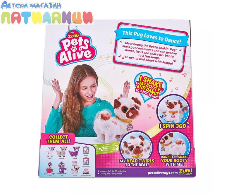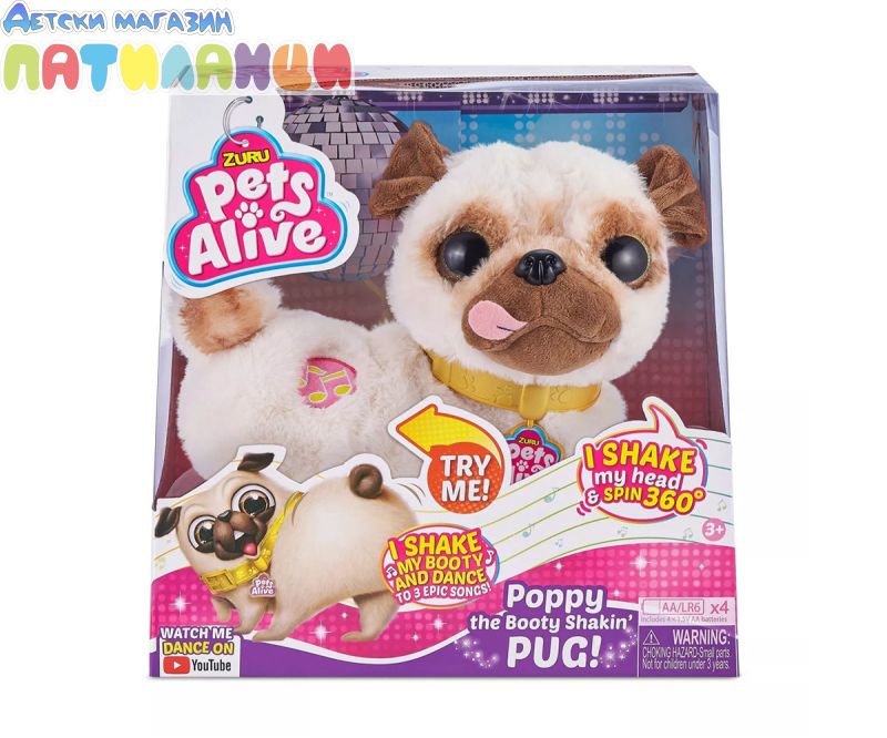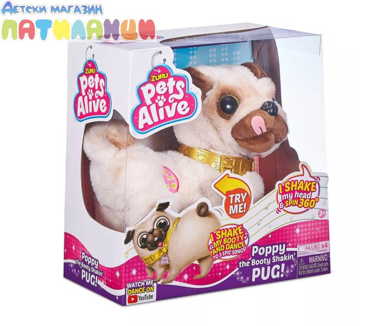 Този мопс обича да танцува! Запознайте се с Pets Alive Poppy the Booty Shakin' Pug, който има забавни движения и може да танцува, върти и разклаща на 3 забавни песни! Натиснете музикалната нота и гледайте как Попи оживява с въртене на главата, въртене на 360 градуса и разклащане. Със сладкия реалистичен дизайн и заразителна енергия е невъзможно цялото семейство да не стане и да не танцува с Попи!