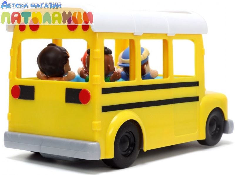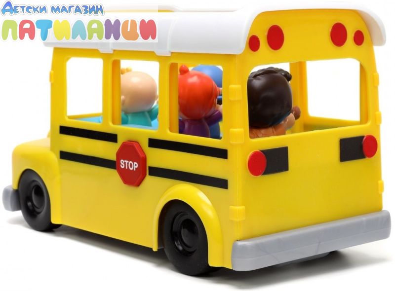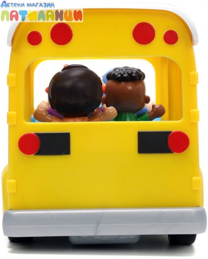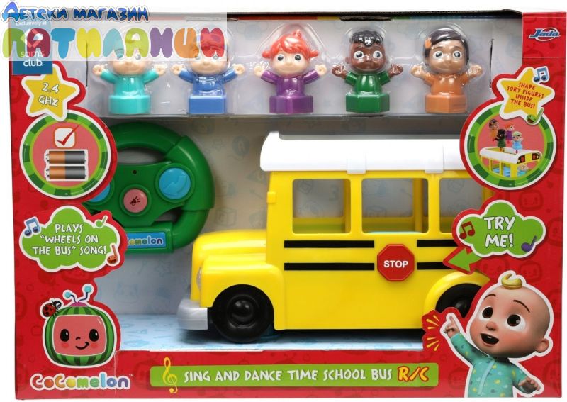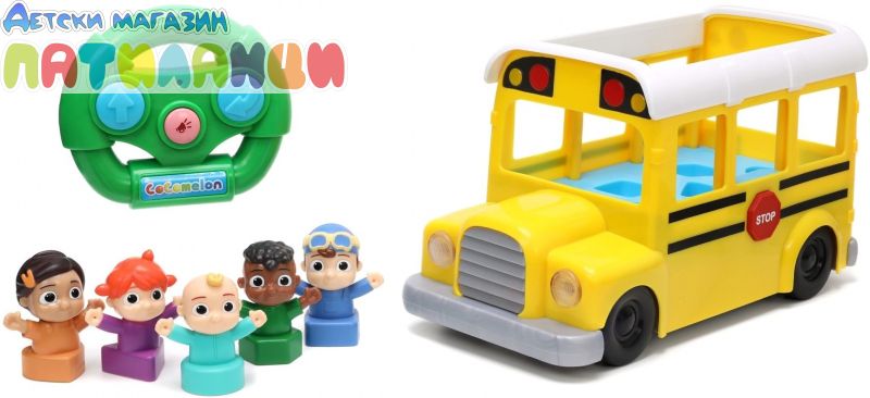Тази страхотна играчка от Jada Toys е 2 в 1 - музикален училищен автобус с героите от Cocomelon и образователен сортер за най-малките. Докарайте Джей Джей и неговите най-добри приятели Йойо, Том Том, Коди и Нина до и от училище в този интерактивен училищен автобус с дистанционно управление. Контролерът е лесен за управление и малчуганите могат да карат напред, назад и да се въртят. Ярките фарове блестят и осветяват пътя, докато свирят детската песничка „Колелата на автобуса“ на английски език и емблематичната песен на Cocomelon.