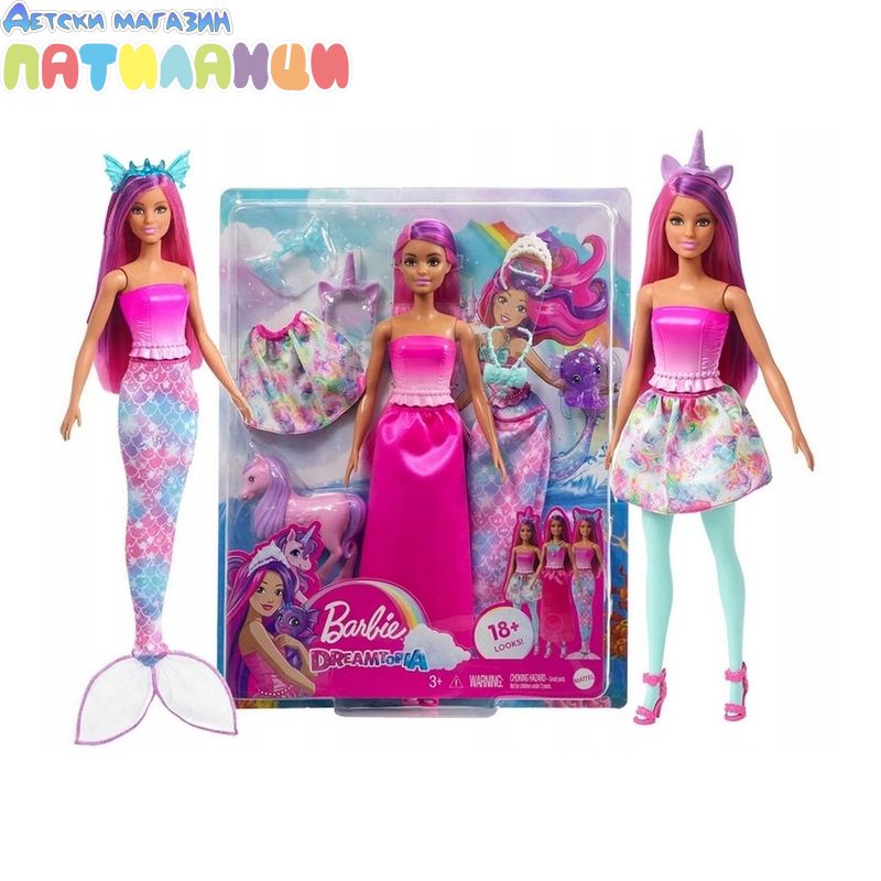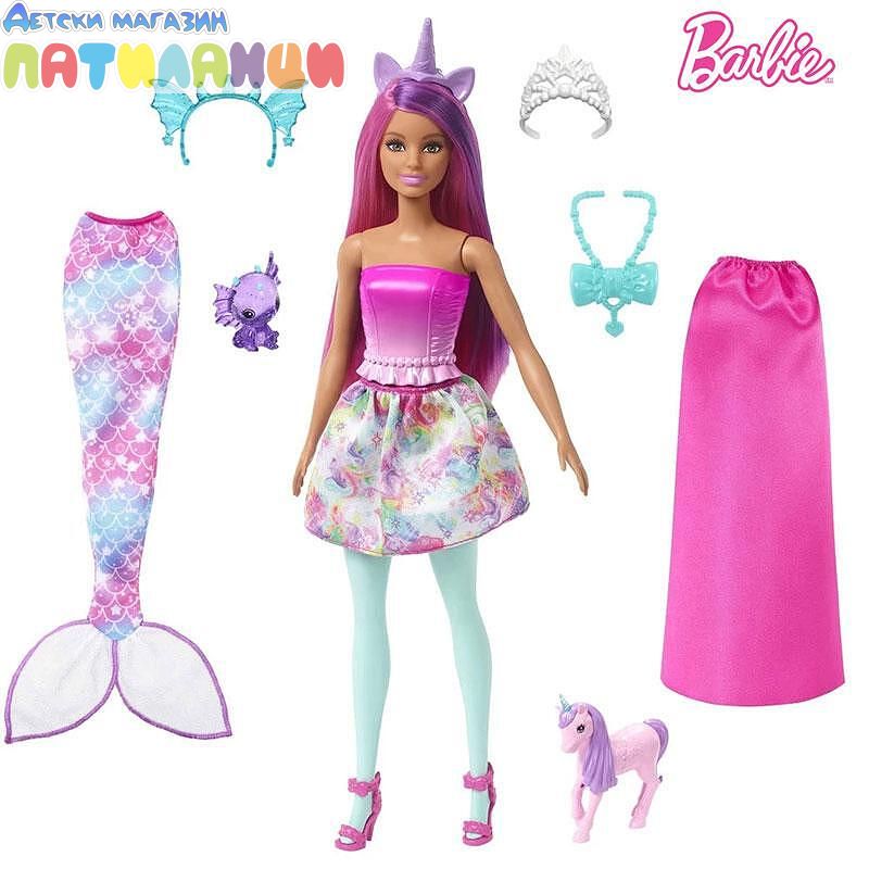 Тази кукла Barbie® предлага трансформираща игра от сушата до морето и въздуха! Тя идва с множество модели и аксесоари, включително опашка на русалка, две поли, тематични ленти за глава и огърлица. Колоритният фентъзи комплект Barbie® включва също бебешки дракон и еднорог за още по-забавно разказване на историята. Куклата не може да стои сама. Цветовете и декорациите могат да варират.
