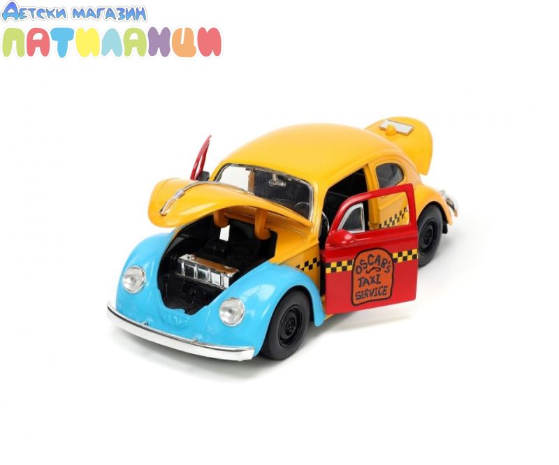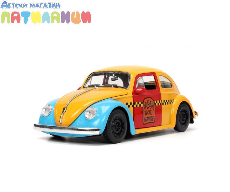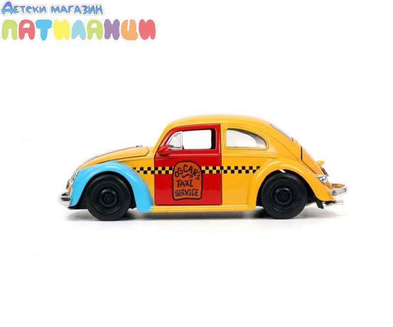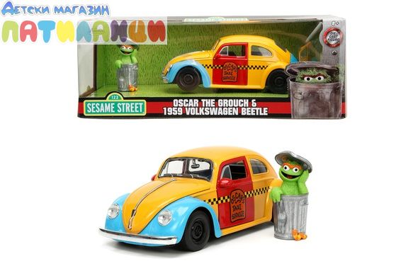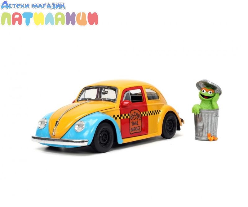 1959 Volkswagen Beetle Taxi Жълто и синьо „Такси услугата на Оскар“ – Чисто нов модел, отлят под налягане, включва колекционерска фигурка в мащаб 1/24 от Jada Toys. Оскар от "Улица Сезам" е висок около 7 см и идеално завършва страхотния декор.