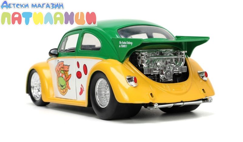 Някой каза ли пица? Можете да се обзаложите, че Микеланджело е на път. Този Volkswagen Drag Beetle от 1959 г. в мащаб 1:24 е перфектното комби за най-страхотната костенурка. С работещи врати и багажник тази кола е най-готиното возило. Вижте другите превозни средства на Костенурките, включително парти микробуса на Леонардо и Chevy Camaro на Рафаел.
