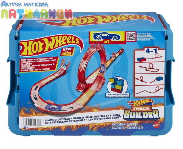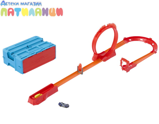 Добавете малко жега към състезанията и каскадьорите с Hot Wheels® елементи за огнена писта. Той включва 16 фигурки за строеж на писти с огнена тема като "пламтяща" верига, огнен пръстен и пламъци - всички те се побират спретнато и удобно в модулната кутия за съхранение. Децата могат да изградят една от четири предложени конфигурации на писти или да създадат свои собствени, смесвайки и комбинирайки с други писти Hot Wheels®. (Допълнителни комплекти писти се продават отделно.) Включена е една кола Hot Wheels®. Цветовете и декорациите могат да варират.