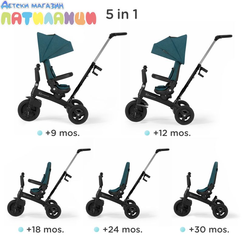 Триколката се предлага с практични аксесоари - Кошница за дребни неща на бебето, звънец и поставка за чаша.