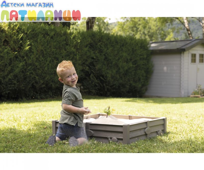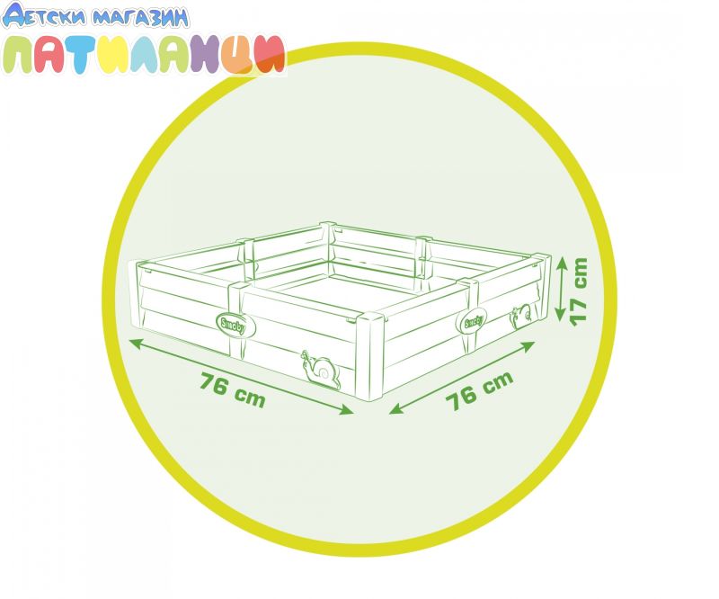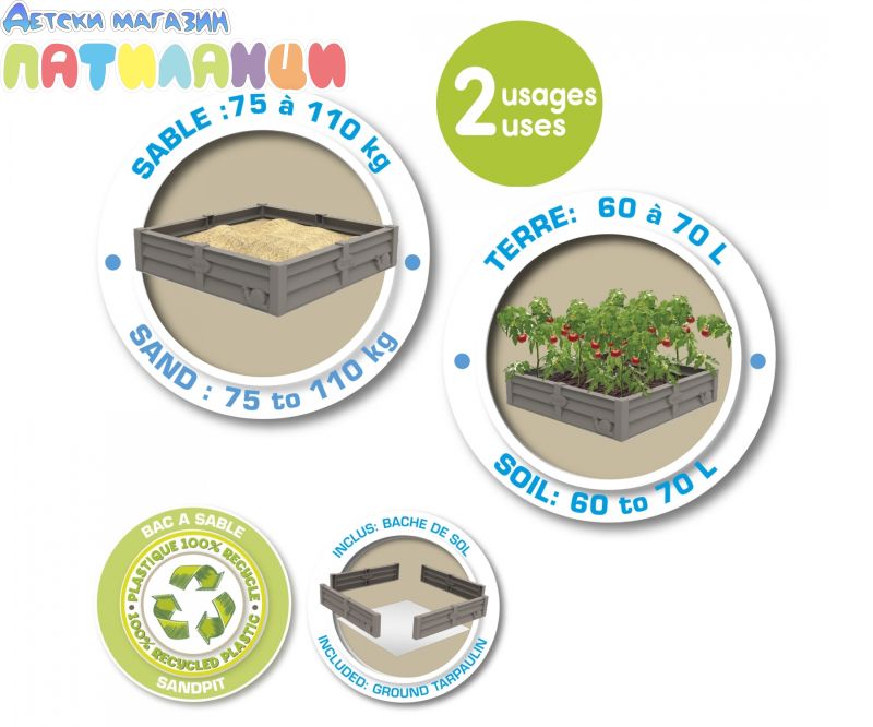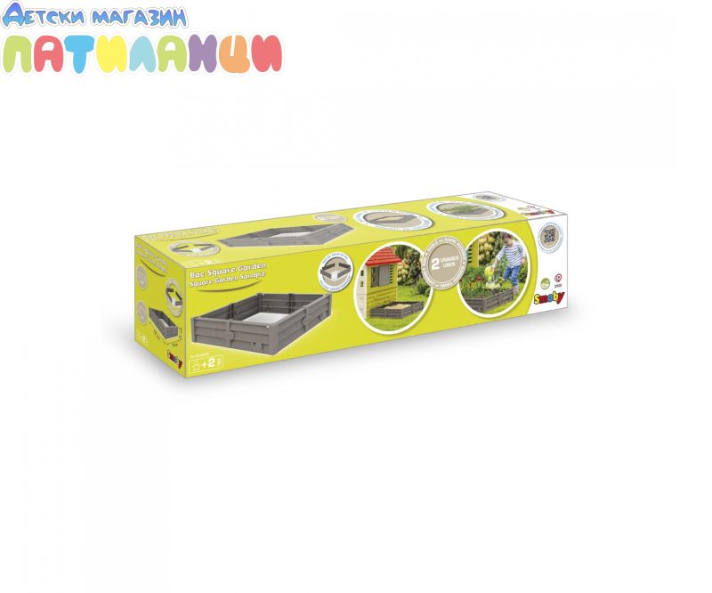 Пясъчникът се сглобява много лесно, защото трябва само да съберете четирите странични стени, за да го сглобите. Може да се постави навсякъде и пасва идеално на всички къщи за игра Smoby. Особено страхотно е, че децата могат да използват Square не само като пясъчник, но и като зеленчукова градина - така те научават за света на градинарството чрез игра. Включен е земен лист. Капацитет: 100 кг пясък или 70 литра пръст. Изработен от 100% рециклирана пластмаса.