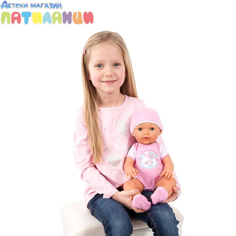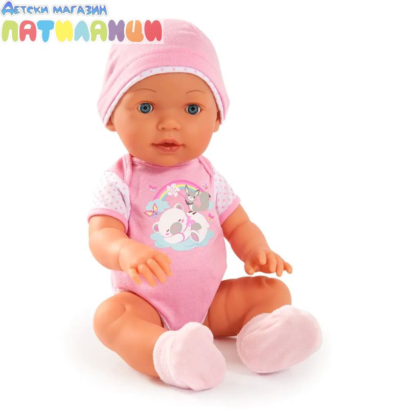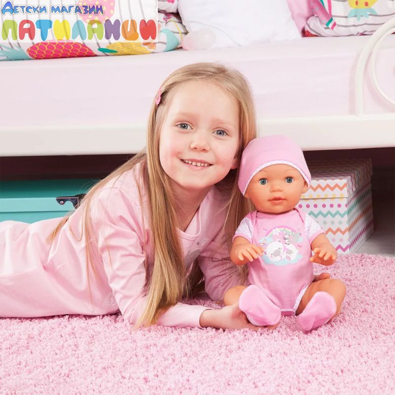 • Куклата е облечена в меко розово боди и шапка.