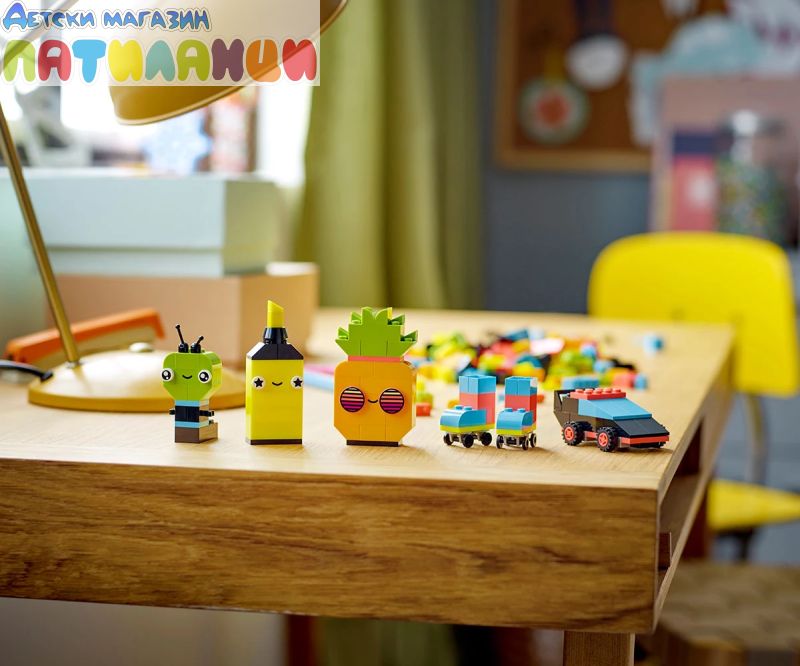 Децата, които обичат ярки цветове, ще харесат вдъхновяващата комбинация от тухлички в неонов цвят. Има 5 лесни за сглобяване модела, които ще помогнат за изграждане на увереност – ананас, маркер, кола, извънземно и ролкови кънки – и безкрайни възможности за забавно свободно конструиране и изследване на модели! Децата дори могат да вдъхнат живот на цветните си творения с 18-те тухлички с очи на комплекта.