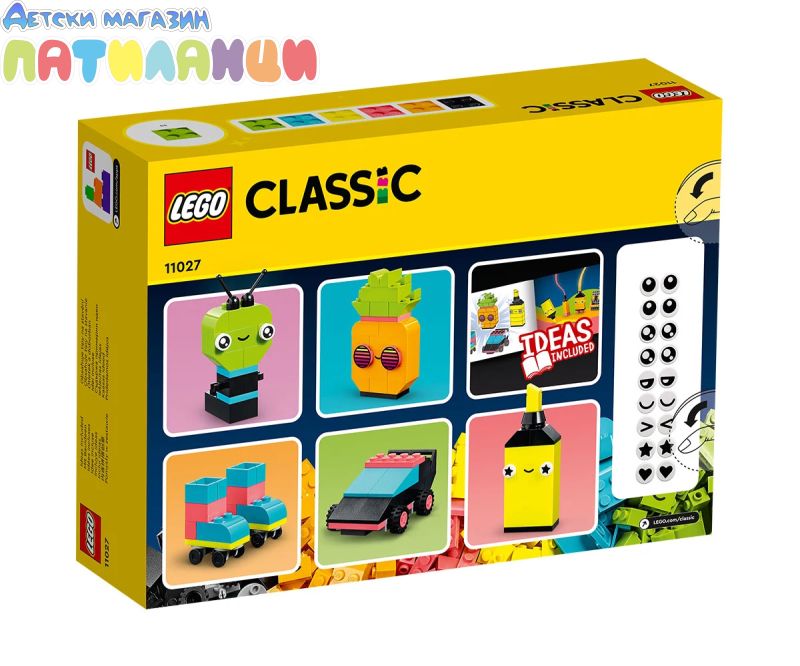 Дайте тласък на творческото развитие на децата с LEGO® Classic Творчески забавления с неон (11027). С предложения за модели за бързо построяване и безкрайни възможности за забавно свободно конструиране, привлекателният комплект вдъхновява начинаещите строители на възраст над 5 години да се отдадат на страстта си към изкуството и дизайна. Ярки тухлички за креативни деца Многофункционалният строителен комплект съдържа 333 тухлички с различни размери и ярки неонови цветове. 18 от тухличките имат изразителни очи, които децата могат да използват, за да вдъхнат живот на своите творения. Включени са печатни инструкции за построяване на 5 забавни модела – ананас, маркер, кола, извънземно и ролкови кънки – които дават на децата творческата увереност, от която се нуждаят, за да построят каквото си представят! Цифрова версия на инструкциите за построяване на комплекта може да бъде намерена в приложението LEGO Builder. За цялото семейство Играчки LEGO Classic 5+ осигуряват идеи и вдъхновение на децата, както и възможност родителите да споделят забавното строителство и важни етапи от израстването с децата си.