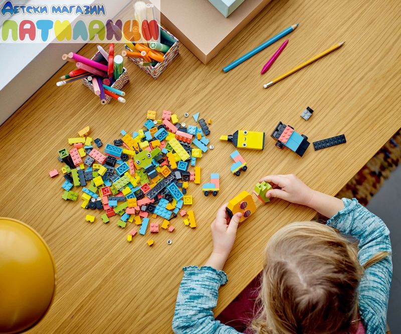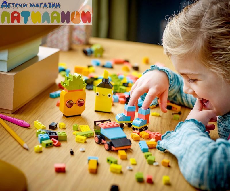 Цвят и креативност – комплектът съдържа 333 тухлички в различни размери и 6 привличащи вниманието цвята. 18 от тухличките имат изразителни очи, които децата могат да използват, за да вдъхнат живот на своите творения;